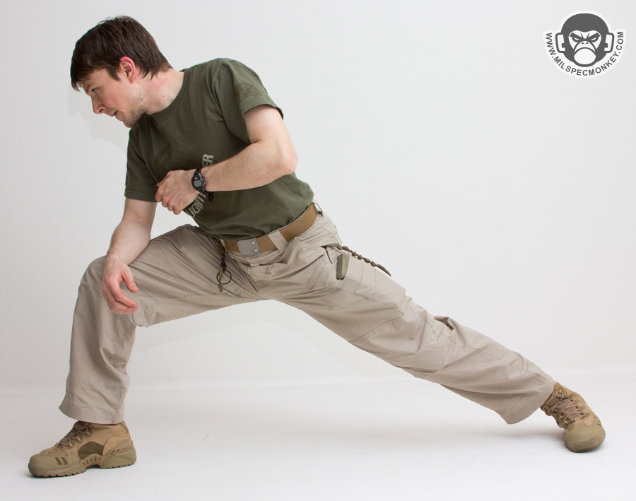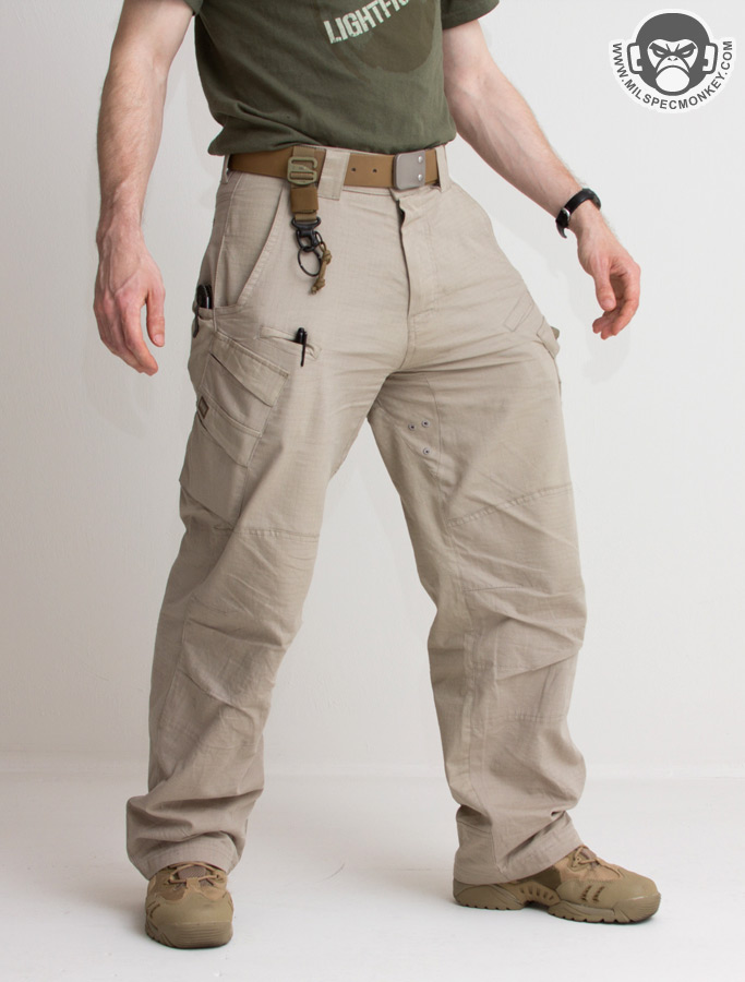 The knee area has some articulation to help with movement and even has knee pad compartments in the interior. I'm not sure which pads they plan on people being able to use, but there is enough space to fit in the 5.11 type pads. Overall fit was nice, allowing solid leg movement in the assortment of action positions I dished out; No noticeable stress on the crotch or thigh area. As expected the light material does help out trying to beat the heat, I do however have some long term concern with the 100% cotton factor as that never lasts as long as my Nylon mix stuff. As for some reasons why they did go 100%, it may contribute to the ColorLock fabric dying process which offers precise color consistency and a 6-Month No Fade Guarantee.