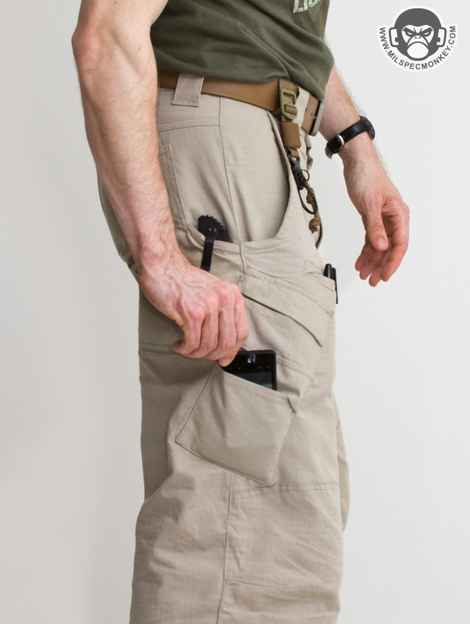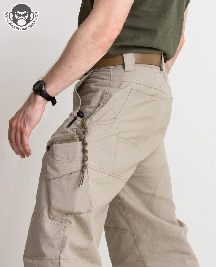 Back on the butt are some simple no flap pockets, most would consider them about medium sized. Low on security, but fits the hot weather theme of the pants and does add some comfort with no flap to create pressure points while sitting. Rather than cargo pockets, more streamlined pockets are in the usual sidal placement. These are rotated substantially and positioned higher which does help out access while standing, sitting, and other action positions as they say. The larger pocket is sized with the intent to hold a standard 30 round NATO magazine. When I first saw it at shot I was all "yea right!", but turns out I guess we are sorta both right. A standard metal mag with fit in there just barely being covered by the flaps, however other larger mags such as the PMAG will stick out some. Sticking out is easier to grab, so this isn't necessarily a bad thing. On top and a little lower is another pocket that works out great for holding most smart phones. Some of the bigger phones like an IPhone with a case are too tall so one would need to use the mag pocket instead to fully cover. Both these areas rely on diagonal flaps for security so there is no velcro or buttons.
