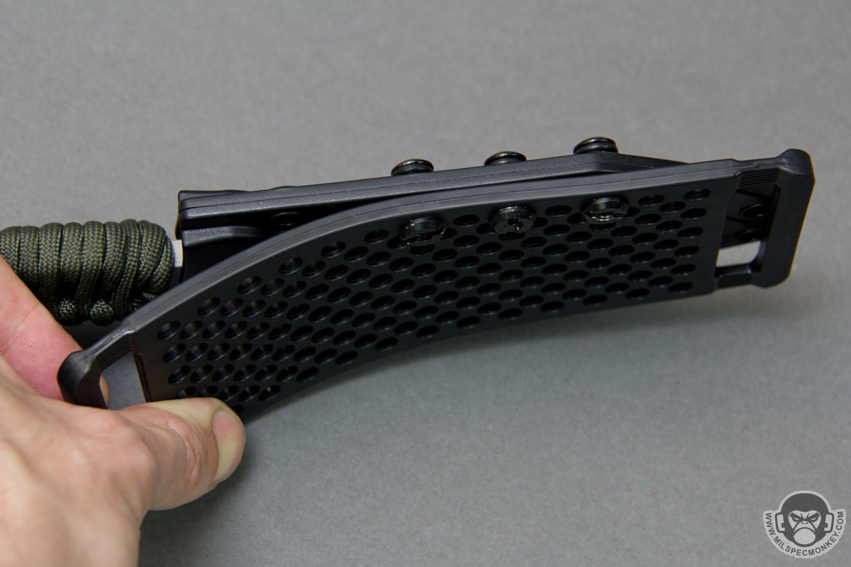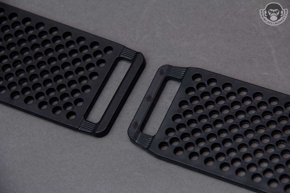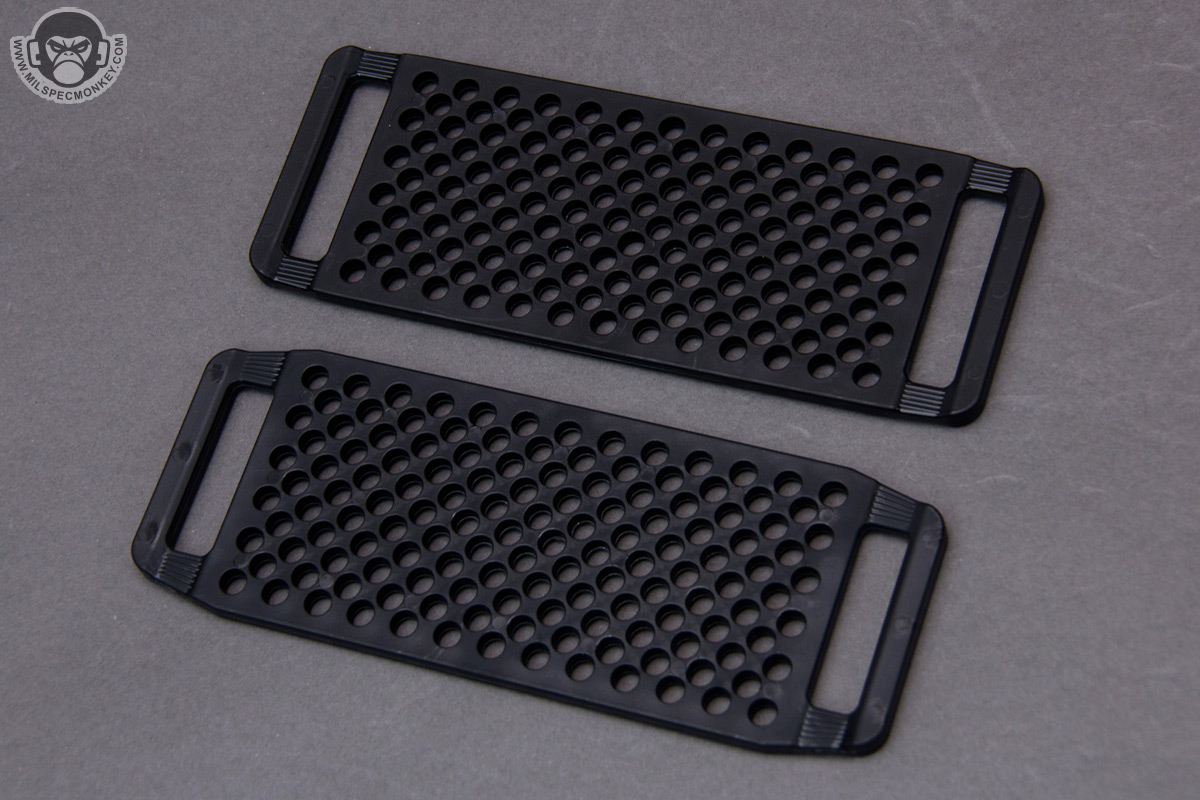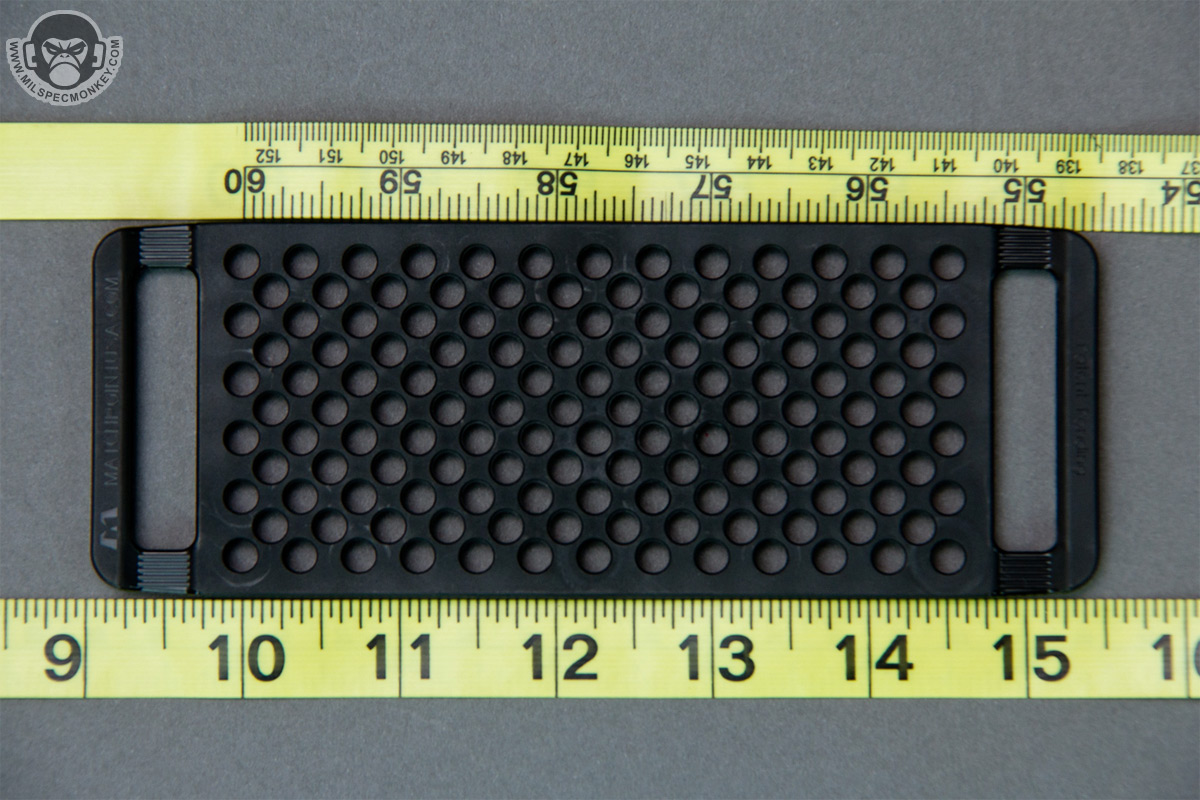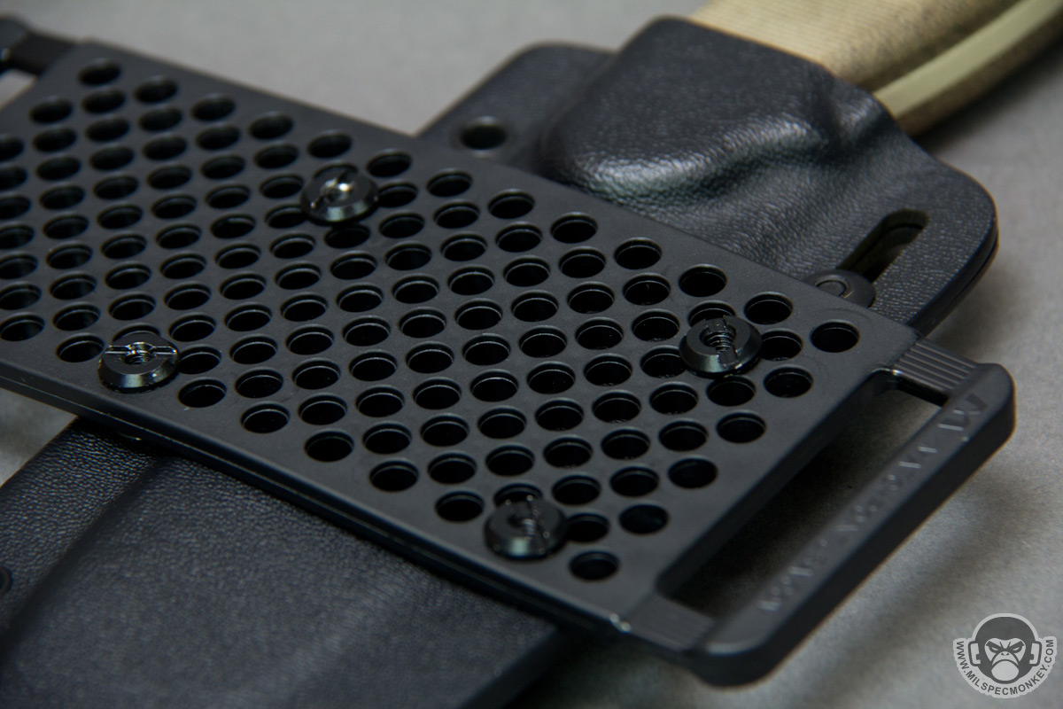 There are some decent sheath attachment options out there like Malice Clips and Blade-Tech Tek-Lok setups, but they don't always have the spacing needed or allow for desired mounting rotation. This is where the MatchPoint USA AMP series comes in handy to offer more mounting options. The basic idea is the platform is a matrix of .215" holes spaced at 3/8" (hole center to hole center) that has belt loop slots on the ends; currently in 1.75" and 1.5" slot sizes. Overall size is approx 6.375" x 2.375" at .2" thickness, and hole matrix zone being about 5" long. The 1.5" version is very similar to the 1.75" version, just with tapered down slots at the end. MatchPoint calls the material Tufmax 720 which is on the stiffer side, but does offer good durability and flex to conform to one's body. Rigidity can be a tricky decision as too rigid just won't contour to anything while too flexible will cause your gear to be floppy. I think MatchPoint made a reasonable balance on the AMP finding somewhere in the middle.