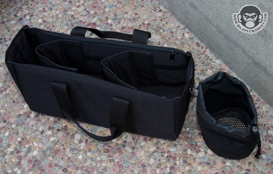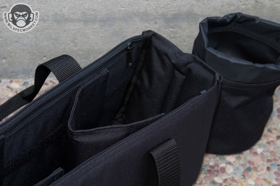 Starting with the front are 2 large square pockets. The right end has a similar pocket and a bonus ID area. On the opposite Left side is a slightly smaller rectangle pocket and a bottle holder. The back has a large rectangle pocket with a long sleeve and sleeves to put up to 8 magazines or similar items. The main flap is a dual zipper flap which lets you open it up quickly and get to your goods unobstructed. On the inside of the main pouch are padded dividers on the front and back walls. As a nice bonus, a "tote" bag is included which fits well in the main pouch. The tote was designed for ammo and brass in mind, but could be used for many purposes. The tote itself has adjustable velcro dividers and long zippered pockets along the walls. Attached to the tote is the removable brass bag which uses a standard cord-lock closure. The shoulder strap has a nice arc that is comfy to wear, however the snap hooks are pretty low speed plastic. From first impressions the dinky snap hooks are the only con I see so far. If one really loads this bag up with guns and ammo it will weigh quite a bit so I'd recommend going for full metal snap hooks. I've handed this one off to one of my SF buddies to beat up on. I'll keep you updated with hopefully some range pics.