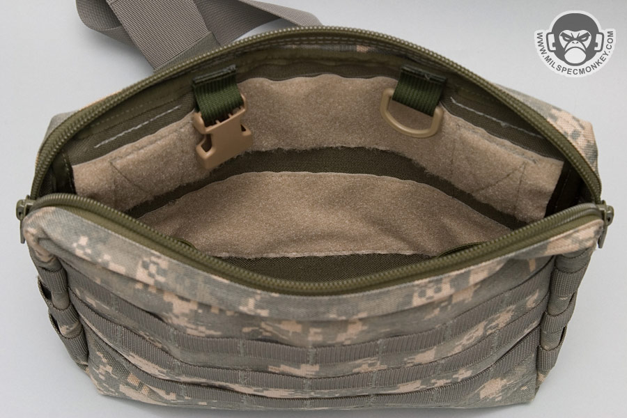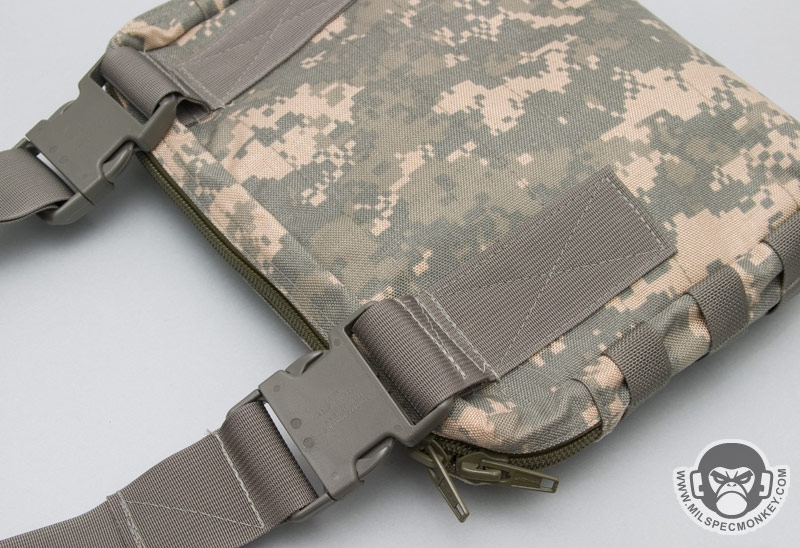 The murse makes for a great platform to customize your own small go bag. Although the bag is a little slim looking, PALS webbing is on the front and sides to expand as you wish. On the inside, both sides are covered with velcro to allow further pouches and dividers to be added. Velcro holsters, mag holders, pen holders etc. can be obtained through Esstac. The sides have big elastic loops to assist in separation for items like water bottles. As a bonus touch, the interior back has a D-ring and SRB for connection points. The shoulder strap is removable using two 2" SRBs. These can be a little noisy and clunky sometimes, but serve their purpose well for strength yet removable. I hope to add more pictures soon showing pouches added.