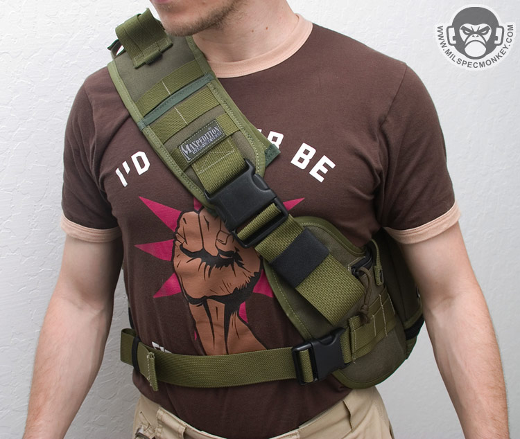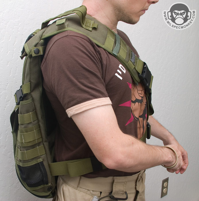 The Monsoon certainly is a unique design appealing more to the urban market, but certainly built tough enough for more demanding tasks. The teardrop shape is a little deceptive in which one can fit more than most think upon first impressions. As expected from the gearslinger name, this is a thick 1 strap shoulder bag design. The first outer flap is a little odd offhand, but allows for a platform to store bedrolls and similar items. The compression straps then can be under or ontop as desired. One side of the pack has PALS webbing and a small mesh sleeve while the other has a nice big Nalgene pouch. Next comes the double zipper main area which has extra sleeves and slim zipper compartments. Also inside is a side pouch for electronics like Ipods and nearby above is a cool rubber headphone porthole. In the far back is the hydration pocket area which has the usual loop velcro to allow for accessories. This pack is generally well padded, but I feel it is made for larger people. I am unable to tighten it to be snug and it rides a bit low. I will see if I can mod the main strap to be smaller soon for a better fit to my monkey size. The 2" velcro'd webbing on the front is for Maxpedition's sheath accessories. Currently available in Black, OD Green, Khaki, and ACU.