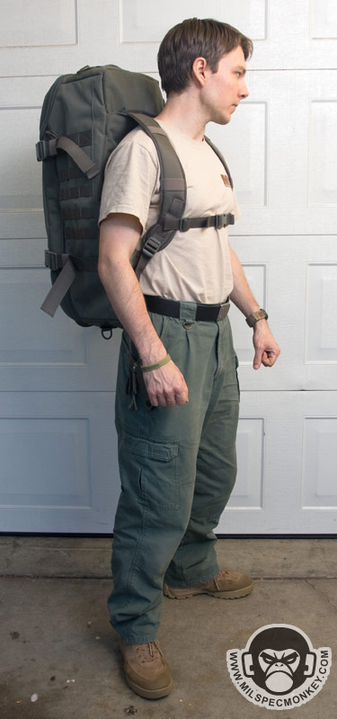 The general shape is lugage based, but some subtle curves have been added which let the pack open and close easy also delivering a comfy ride in shoulder or backpack mode. On that note, there are 3 main modes of carry: Main handle in the middle, Optional shoulder strap, or Integrated Backpack straps. The middle handle is nice and beefy with foam around it for comfort. This won't be the most used method, but is good for quick pick up and go action. I like how it is just in the middle and doesn't prevent access to the bag. The included shoulder strap is based on what Maxpedition usually gives which is pretty good. 2" webbing with plastic snap hooks and a pad that attaches with velcro straps. There are D-rings on each corner of the pack for a total of 4 to allow you to get creative with shoulder strap connection. I like to do it as shown in my first picture since this way my body mostly comes in contact with the bottom. It has a good amount of foam padding down there to aid in comfort with a dash of item protection. My fave is the backpack straps which allow the best mode of carry for long distances. The straps are connected to the bottom of the pack which then connect to lower D-rings with snap hooks. Even a sternum strap is included. When the straps aren't needed the user just unhooks the snaps and then can tuck the straps into its own zippered pocket. This makes the bottom nice and clean, great for air travel where a bunch of straps can result in a shredded bag.
