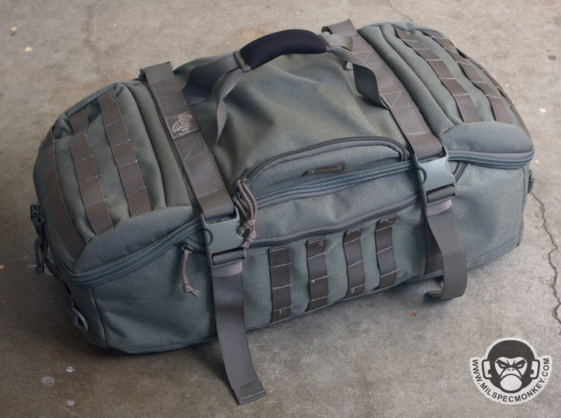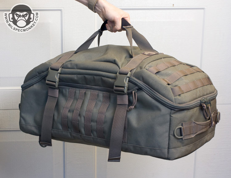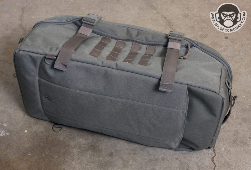 Other external features include nice drag handles on the ends. They are big enough to grab, but not too big to be snag hazards. I'm usually not a fan of compression straps, but they make a log of sense for the DoppleDuffel. 4 SRB buckles allow you to smash things down nice and flat when your pack is empty. Although 2 buckles need to be released to open the main compartment, this is reasonable since when compressed this pack gets considerably smaller. For additional modularity there is PALS webbing on the top and middle sides. Slimmer pouch additions are appropriate for the top areas while larger ones can work on the sides. Although I see the PALS webbing formation is appropriate when the DD is worn in backpack mode, I wish the side PALS webbing was in the other direction and more of it. This way I could fit something like an Emdom Wide Load Fatty.