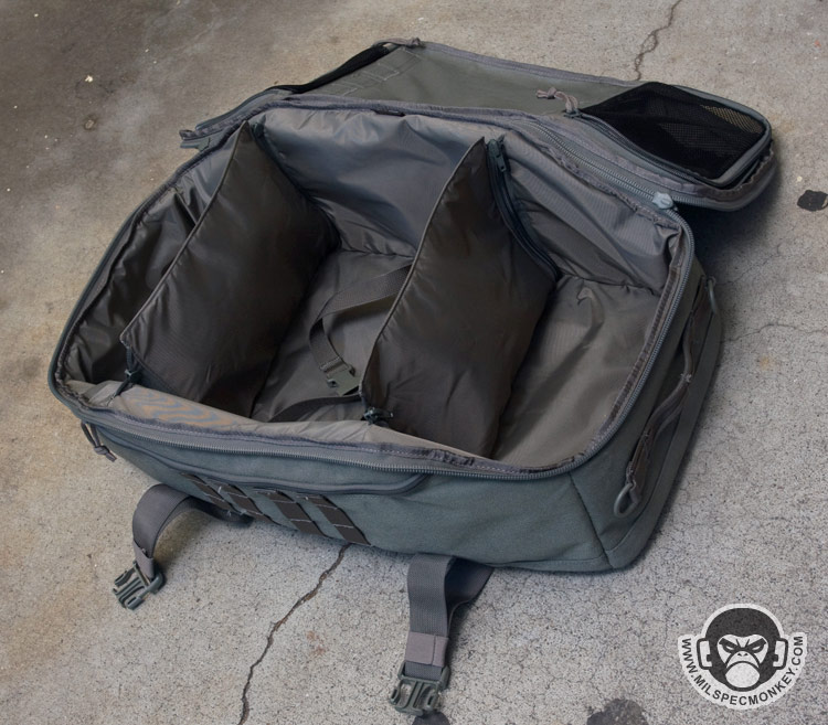 The main show is definitely the main compartment, but all the sneaky organizer pockets are quite handy as well. Starting in the top middle is a double zipper external pocket. Good for quick access items or when you have fully stuffed all of the other pockets. On the sides are long slim pockets with single zipper access. Inside are mesh sleeve pockets for further organization. Although slim pockets, one can fit a lot of tool items or weapon magazines in there. It is also a great place to put the shoulder strap when not needed. On the inside the main lid has 2 mesh zipper pockets integrated which are good for toiletries or electronics. For even further separation there are built in dividers in the main compartment. These can be zipped up when needed or zipped down and folded over when not. In the middle is a strap that connects with an SRB for lash-down options. For an extra detail the main compartment zippers are even lockable to keep those out who may have taken some "shipping tax". These zippers can get a little loud during heavy movement, yet can easily be fixed by cutting off the metal pull tabs and just reattaching the pull cords.