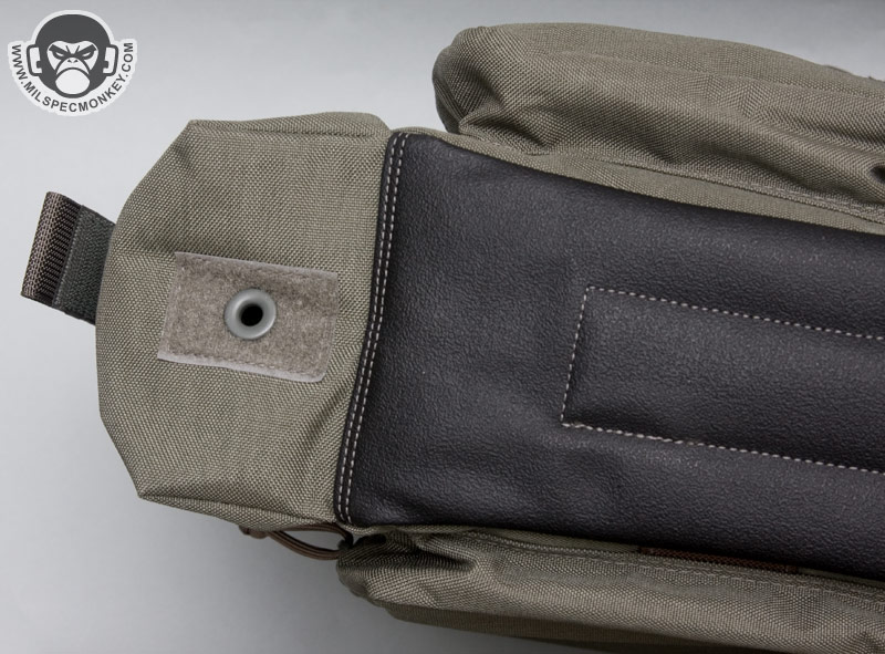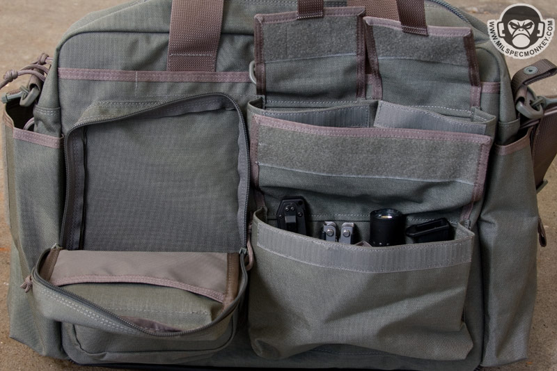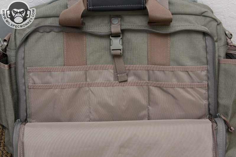 The opposite side is one big double zippered area that unzips down most of the way, but not a full clamshell style. A snap loop is nearby to secure these zippers if desired. The flap itself is padded with a loop velcro area on the exterior and the interior back is an organizational sleeve fiesta. This area is great for holding paperwork and writing utensils, but hell if you wanted to you can fit a smaller laptop in here. Above this large pocket are some velcro loops that I guess are used to hold beatsticks and large flashlights. Since I use neither they kinda get in the way of the zippers by getting in the way of the handle so I plan to cut them off. The ends of the Aggressor have large tube pockets, one optimized to hold a water bottle and the other for large radios. One can mix and match as they wish, but the hydration side appropriately has a grommet for drainage and a thicker bungee flap. While down there it can be noted the bottom of the core bag has non-slip material for grip and enhanced water protection.