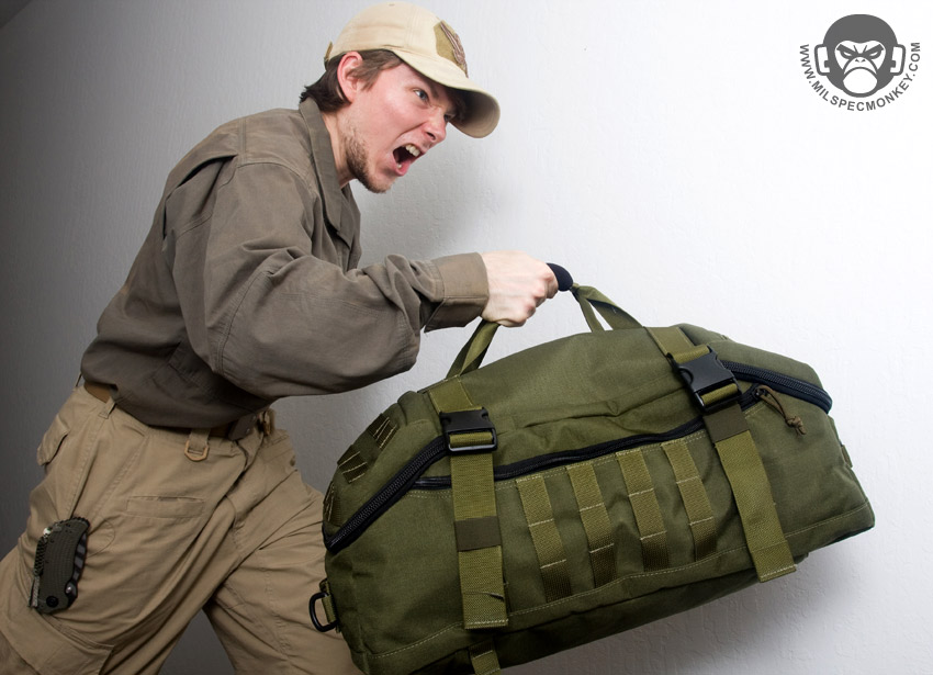 The DoppelDuffel is a great all purpose bag, however was a little bit bigger than most airlines wanted to deal with. The result is this FliegerDuffel variant which is slightly modified to be an acceptable size for carry-on in accordance with FAA regulations and most airlines. Despite being overall smaller, the shape is actually a little wider than the Doppel where you can see the Flieger has 8 PALS channels on the top rather than 6. Almost all of the core features are on the Flieger such as: 4 compression straps, long side zipper pockets, lock-able main zippers, beefy handles on top and both ends, removable shoulder strap included, 2 interior lid mesh zipper pockets, and an awesome stow-able backpack strap system.
