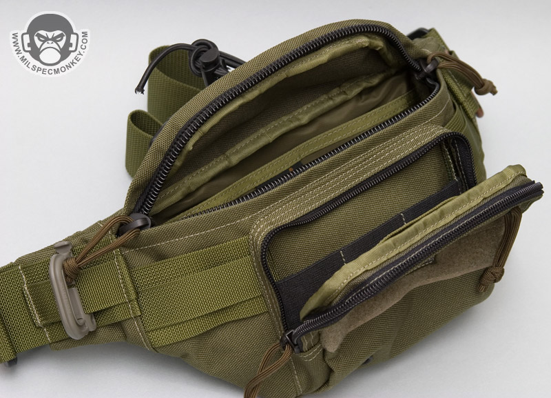 The end result is a great waist pouch for military and civie adventurers a like. For starters the usual Maxpedition heavy duty nylon is used for the construction to set this apart from bargain big packs. The pouches are well laid out with dividers and bonus elastic in the front compartment. Loop velcro is on the exterior for ID patches and the top space it utilized more than usual with a flap and shock cord rig. The flap is good for quick access to flashflights or beatsticks and the shock cord can accomodate bigger odd shape items like water bottles. The Octa comes with a removable 2" waist strap, but really excels in mounting options. The back side has PALS webbing and further 1" webbing loops are on the sides on the back and front. This way you can attach the Octa about anyway you want including malice clips, grimlocks, silk clips, and more. With all the connection points one also has more versatility on placement to mount it on gear such as chest rigs. Currently available in Black, Green, Khaki, and ACU.