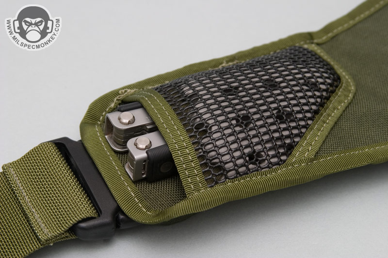 The back area is for the most part totally new. For cooling standoff, foam with rubberized nylon grid is used which looks like it will be much more durable than the air-mesh on the Jumbo. A good dose of this is on the back and the shoulder strap connection areas. Up on the strap areas are sleeves which work well for holding folding knives. I show these sleeves can fit multitools in my pictures, but they are not the most comfortable things to carry there. In the middle is another CCW pocket which is closed with a hypalon flap. The closure is velcro with a metal snap in the middle and a D-ring is up top for an easy grab to get to the pocket. The velcro belt loop connection is also on the hypalon area which can fit up to 2.5" belts. For those who don't know what hypalon is yet; it is really heavy duty rubber-ish material with little give and non-slip qualities. Inside this back area is another 7" x 8" loop field for another place to put modular velcro attachments. Although I do not have one to try, this pocket is also made to fit a 50oz. or smaller hydration reservoir and has a webbing loop for a hanging point. Despite being easier to open up, I don't like this area as much for CCW. The pistol handle can be fairly visible when viewing the side of the pouch and you can't use the belt strap since it interferes with pulling the pocket open. A pistol is easier to get a hold of without the modular holster, but then it is less secure and could flop out while running. Even though I don't sound so jazzed about this back pocket, it is nice to have it there rather than nothing and likely others will find great uses for it.