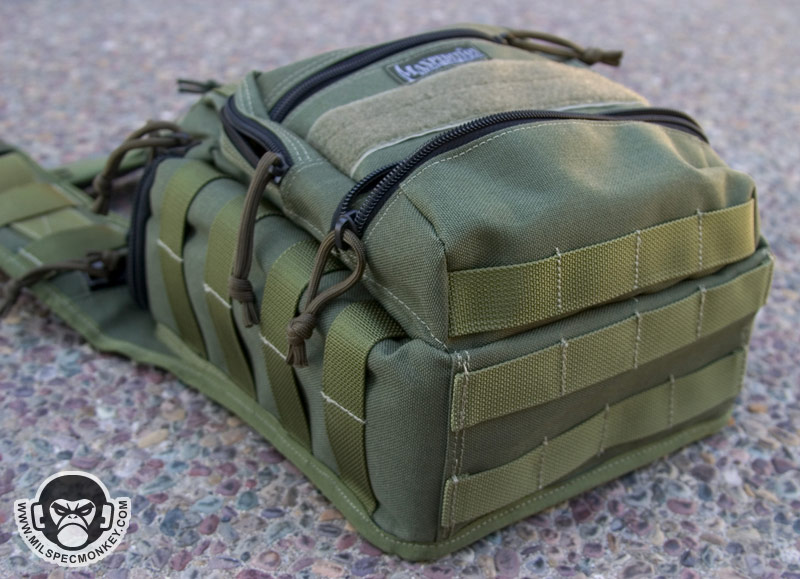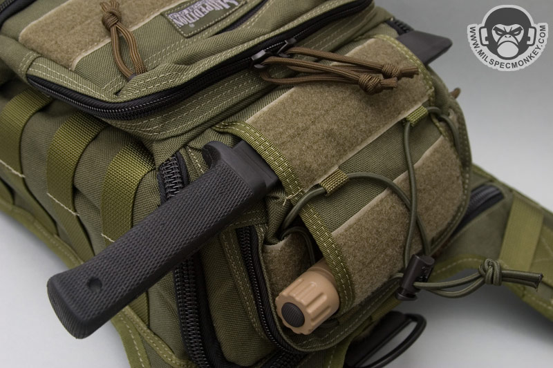 While the Colossus went in the size increase direction for the Versipack line, the Manta went the opposite way. The Manta on its own is not much more than beefy shoulder strapped CCW pocket, but has huge customization possibilities when other pouches are added. Due to all the PALS webbing on the front of the Manta, this makes a great platform to form the Versipack you always wanted or just need on specific day. One simply attaches other PALS compatible pouches as desired. The upper area is 3 Rows x 6 Channels (not counting 2 extra loops up top) and the lower area is 2 Rows x 4 Channels. The upper area has loop velcro between the PALS rows for ID patches. I'm not a fan of the Maxpedition logo being in the middle of the upper velcro strip, but one can destich it off without too much hassle. The lower area comes with a shock cord and cord lock rig and is ontop of a sleeve which is good for flashlight like items. I personally would have gone with 2 Rows x 6 Channels for the lower area. The sleeve area would be lost or harder to use, but this would allow a lot more mounting options. When creating loadouts for the Manta I find myself adding pouches where I want to, but they are less secure since the PALS webbing I spoke of is not there.