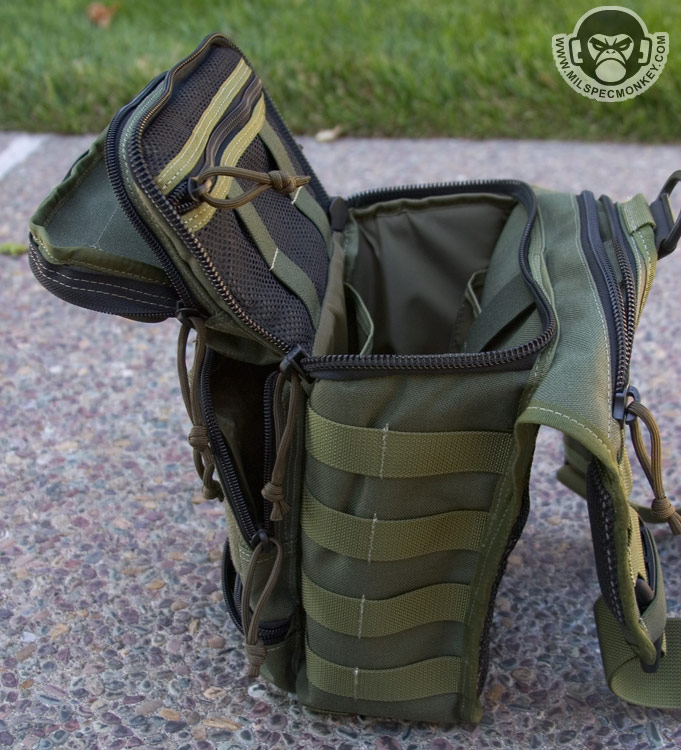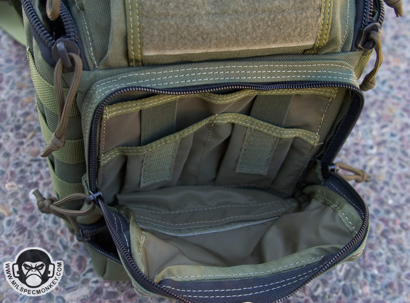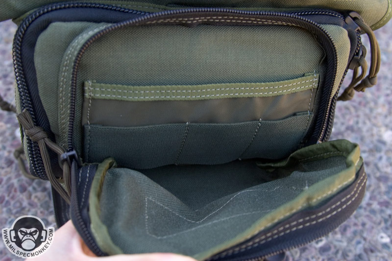 Moving a little further down is what I call the mid pocket. This area is a good square size and has 2 sleeves in the back each with elastic velcro flaps. Behind these is another divider sleeve. At the bottom is a velcro seal to allow one to close off or create access to the lower pocket. On the exterior of the mid pocket is a loop velcro panel and a slim single zipper pocket. Maxpedition has been listening to my suggestions and put the logo out of the loop so the pride can still be there, but not at the cost of your velcro space. Blending in at the bottom is the lower pocket which has a single zipper opening and can fit a beefy, but not super long flashlight.