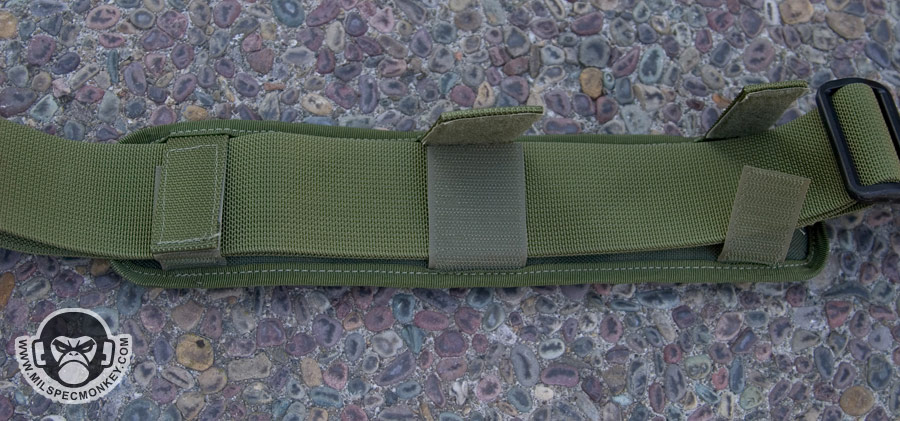 The adjustable shoulder strap has one female and one male side and comes with a removable shoulder pad. The pad is similar to the old style with velcro flaps, but the bottom now uses the foam with rubberized nylon grid. The connection points back on the actual pouch have elastic loops which are great for having over the SRBs to help prevent accidental opening. If one does not need this and wants easier operation, they simply push SRB out under the elastic and let it rest on top.