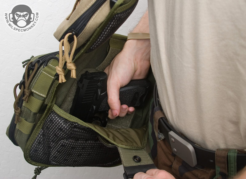 The main CCW area hasn't changed much which is not a bad thing. A big plus is the double zipper opening to make things more ambidextrous. Like before on the Jumbo, this pocket has a big 7" x 8" loop field great for holding the maxpedition modular holster or mag / multitool holders. When going all out CCW, I suggest deciding on your most comfortable zipper opening direction and then making a big pull cord for that zipper. Then make sure to move all the other pull tabs away from the pull cord so they are not in the way. On the Manta when CCW is in mind, I do not use the top PALS row to give myself good room to grab the zipper pull. Back to both, a slight problem occurs when mounting extra pouches to the webbing on the upper area where the straps connect. Pouches that "fit" here usually start to dig into your zipper area. This isn't a show stopper, but does cause one to have less of an opening since the zipper will ram into the pouch or its Malice clip.