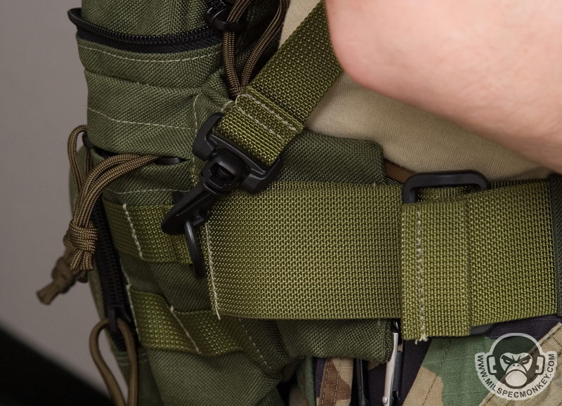 The upper frontal zipper is the main show which is access to the guts of the pack. From here one can uncompress the rest of the pack into its backpack form. Once pulled out, the shoulder straps are clipped onto the D-rings that are on the side exterior. The upper flap doesn't really have anywhere where to go, so is secured with metal snaps to what is now the back of the backpack. When secured, the flap presses up against your back so I recommend taking of the cordlock to avoid discomfort. A sternum strap is included with the shoulder straps and a carry handle on the top of the expanded pack. The extended portion has a square zippered pocket that includes PALS loops on the exterior. For a bonus there is loop velcro between the webbing and a shockcord cord-lock rig. Inside this pocket is a mesh divider. A little further up is another external sleeve area with loop velcro with an additional shockcord and cordlock setup for a total of 3. Main access to the backpack is through the upper double zippers. They don't go down very far on the side of the pack, however there is a lower/middle double zipper opening to get to the main area as well. The inside of the main area has large velcro pieces to internally let the user section off the lower part from the expanded upper part. The lower internal part also has a divider sleeve pocket close to the back and a mesh divider close the the front. The big velcro pieces can be stored in these dividers when not in use.