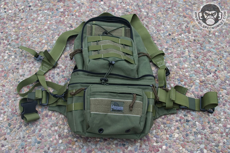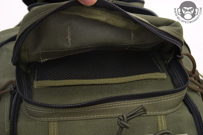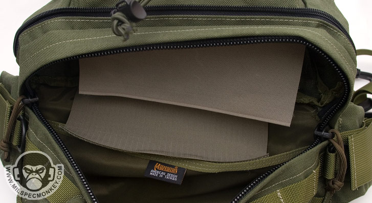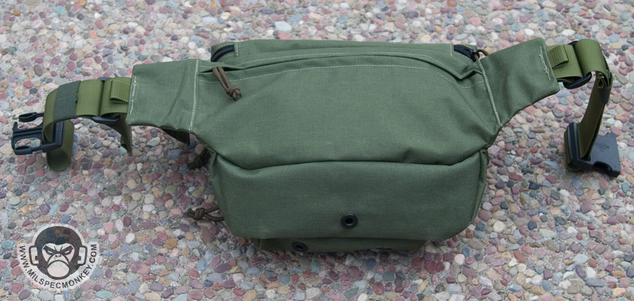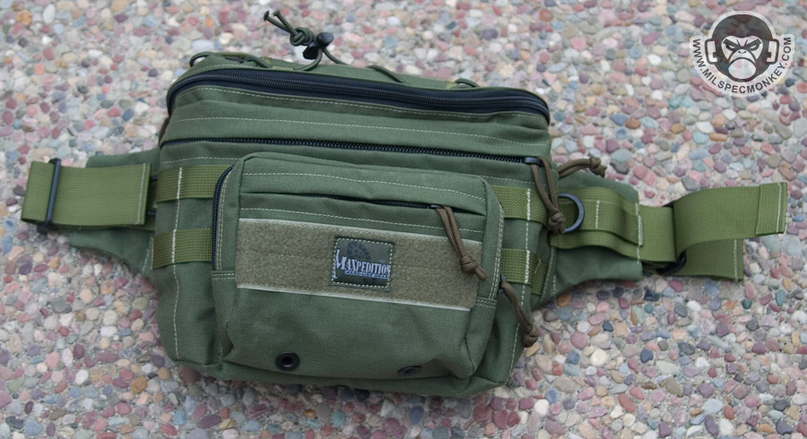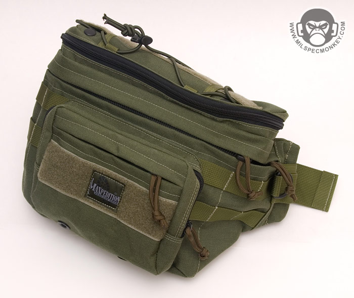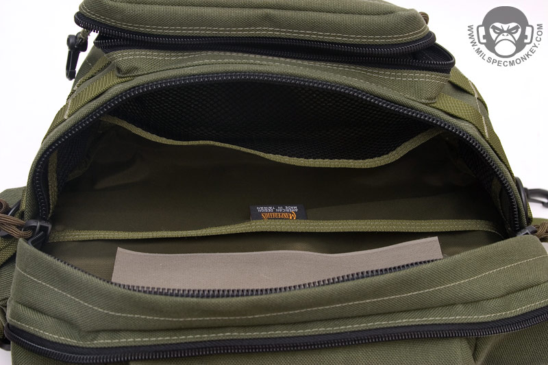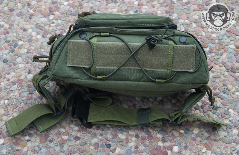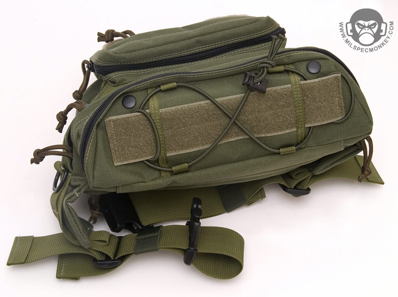 Starting with the exterior while collapsed, the pack is made to be worn around the waist. Although it can be worn up front, it is a bit big, so will bump into your legs while moving. Thus, users will likely wear it as a butt-pack most of the time. The most exterior pocket is a slim 1 zipper pocket with loop velcro on the front. Sadly a large Maxpedition logo is right in the middle of the velcro that could have been placed under it. This pocket is on a larger zipper pocket that has elastic on the inside with 3 loop divisions and a plastic lanyard buddy. The frontal exterior sides have PALS loops of 3 channels x 2 rows each side which allow for some decent pouch add-on options. The actual belt area is "pimped" out like the Octa with webbing loops to allow alternate attachment options like grimlocks. Up top is a shock cord and cord-lock rig to allow lashing down of items. Also up here is a velcro loop covered sleeve good for holding long items like fixed blades or flashlights. I'm not quite sure why there is also loop velcro under the sleeve since adding a strap here would be odd. On the back is a long and slim zippered pocket. Since usually against the body, this makes this pocket somewhat more secretive.