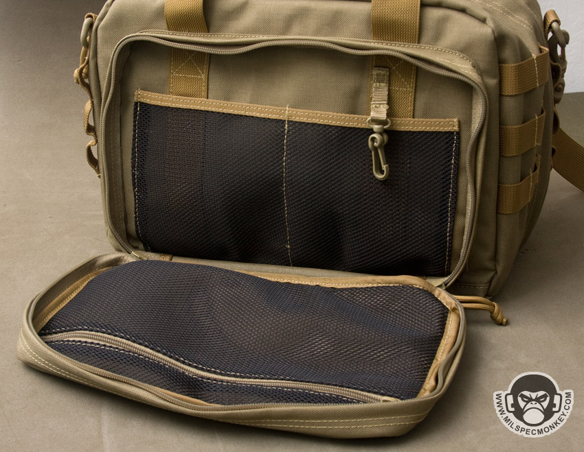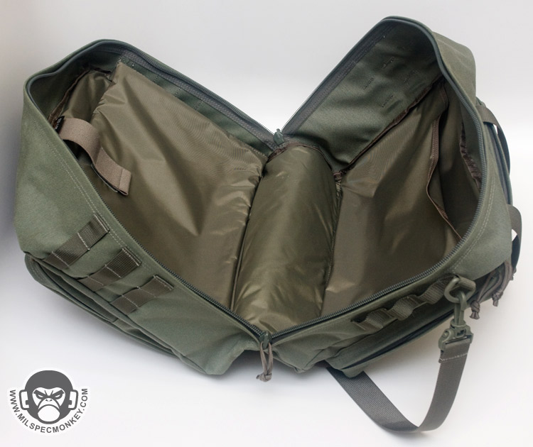 The main compartment opens up with dual zippers that go all the way down to the bottom, but not quite clamshell style. This allows for a nice wide opening and as a bonus the zippers are even lockable. The main compartment inside is pretty straightforward, however does include a sleeve pocket on one side and a padded side compartment for goods such as laptops. An elastic and velcro strap is included for retention on the laptop compartment. Rather than right down the middle of the main compartment, the zipper is on an angle. Using the offset space on the sides, there is a D-ring for the shoulder strap on the thinner side and 3 rows x 2 channels of PALS webbing on the wider side. On the other sides are secondary pockets with dual zipper openings. One has loop velcro on the exterior and only unzips halfway down the sides. The interior has a simple mesh sleeve pocket divided into 2 parts. The other side has a full clamshell opening and has a mesh sleeve pocket as well, but also has a key lanyard and a large single zippered mesh pocket. For ease of grab-and-go, 2 beefy webbing handles are up top which appear to wrap around the main compartment.