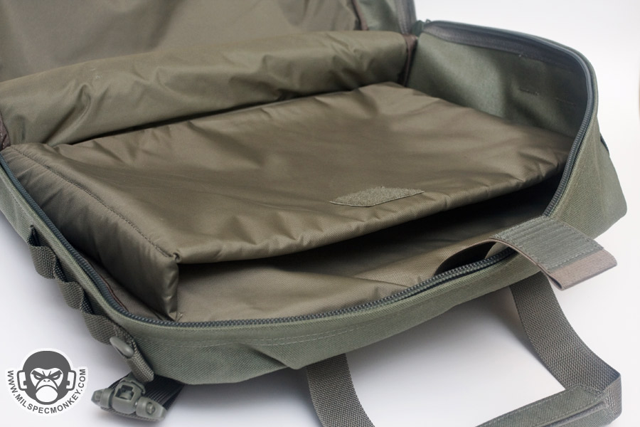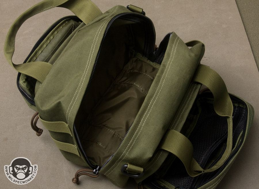 The main compartment opens up with dual zippers that go all the way down to the bottom, but not quite clamshell style. This allows for a nice wide opening and as a bonus the zippers are even lockable. The main compartment inside is pretty simplistic, however does include padding on the bottom and a sleeve pocket on one side. Rather than right down the middle of the compartment, the zipper is on an angle. Using the offset space on the sides, there is a D-ring for the shoulder strap on the thinner side and 2 rows of PALS webbing on the wider side. There is no stitching in the middle of the PALS so they are loose perhaps in favor of mounting size fudging. On the sides are secondary pockets with dual zipper openings. One has loop velcro on the exterior and only unzips halfway down the sides. The interior has a simple mesh sleeve pocket. The other side has a full clamshell opening and has a mesh sleeve pocket as well, but also has a key lanyard and a single zippered mesh pocket. For ease of grab-and-go, 2 beefy webbing handles are up top which appear to wrap around the main compartment.