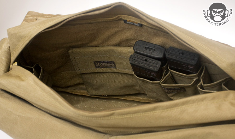 On the interior the main flap itself has a slim yet large single zippered pocket good for documents and or smaller items. The main compartment is more protected than most messenger bags including a double zipper closure with rain flaps. This causes loss of the large opening some may enjoy on classic messenger bags, however gives huge security improvements. With these Maxpedition designs, users can leave the main compartment open with the flap secured to allow fast access through the flap zipper or, have both the main compartment and flap closed for full security. For some reason the double zippers to the main compartment have no pull cords which sucks as they tend to hide under the rain flaps. This makes usage quite a hassle, but luckily is easily fixed cheaply by adding any sort of pull cords. Having rain flaps at all is somewhat odd since that is the main flap's job, but perhaps this is to allow users options to roll with the main flap open. Inside the main compartment the space is simplistic yet lined with fuzzy loop velcro goodness. The front and back is lined completely with loop giving full modular velcro pouch possibilities. As a bonus even the slim sides have some loop, enough to hold the smaller attachments. To clarify, no velcro pouches are included, but I do show some in the pics that Maxpedition offers. They add a lot of customization options rather than being stuck with just a slim sleeve and a couple pen pockets like on typical messenger bags.