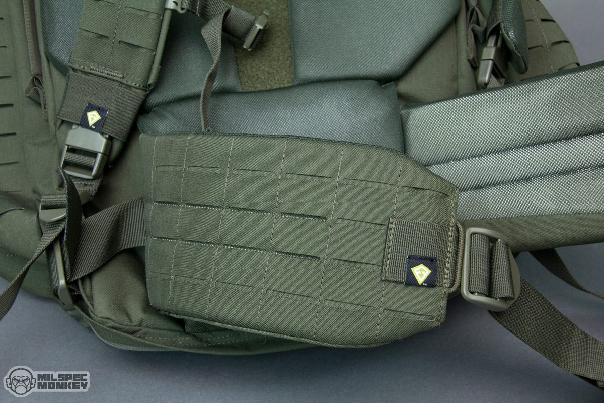 Keeping with the modern trends, a laser cut MOLLE/PALS slot system is used as opposed to traditional webbing. First Tactical calls it their Lynx Laser Cut Platform consisting of laser cuts in Two layers of 500D nylon fabric laminated together. They claim the system is 20% stronger which I'll be honest is hard to believe, but the expanded mounting positions offered is definitely noticeable. With the slots you get the equivalent of half step options when it comes to vertical mounting concerns and also more consistent slot options on the compartment borders. On traditional webbing setups frequently the end slots end up off spec. As one can see just glancing at the pack, there is a generous amount of PALS slots on the front and sides, with 6 columns on the front and 4 on the sides.