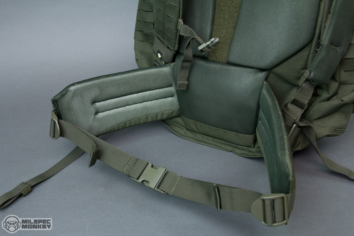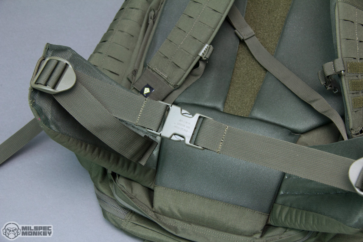 The back of the pack and shoulder straps have a good amount of padding with airmesh material to aid in comfort and airflow. The main padding placement makes somewhat of an airflow channel down the spine that while minimal is better than nothing. Although not included, the pack is ready for a fancy hip belt integrating with the lower back pad, or if needing a simple waist belt, there are 1.5" tri-glides to attach to. Recently available I was able to integrate a Tactix Waist Belt which makes quite a bit of sense on a 3-day sized pack. The waist belt works for any of the First Tactical packs with the same lumbar pad style which is some nice cross compatibility. The waist belt is fairly straight forward, overall easy to install and nice that it has PALS slots on the sides. I'm small so I have to crank it down pretty tight thus the webbing just dangles with no obvious way to secure it, so I'll probably make some simple keepers at some point. In theory I would like the webbing setup if the ladder locks went the other direction causing the webbing to go away from one's body rather then towards the center. Alas but I am monkey sized and probably most humans don't tighten it down as much. For a tiny complaint one can see the white padding through the od-green mesh, not a big deal, but I would have gone with black if an option. While on the subject of the waist belt it seems with the price difference of 1-Day Plus being $180 retail and 3-Day being $250 that the 3-Day should include a waist belt, however compared to similar out there one could just say the 1-Day Plus is just that much sweeter of a deal.