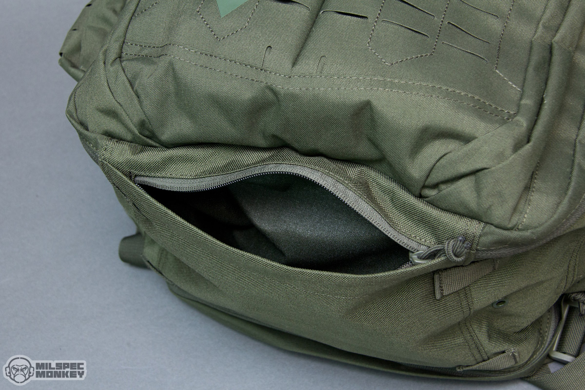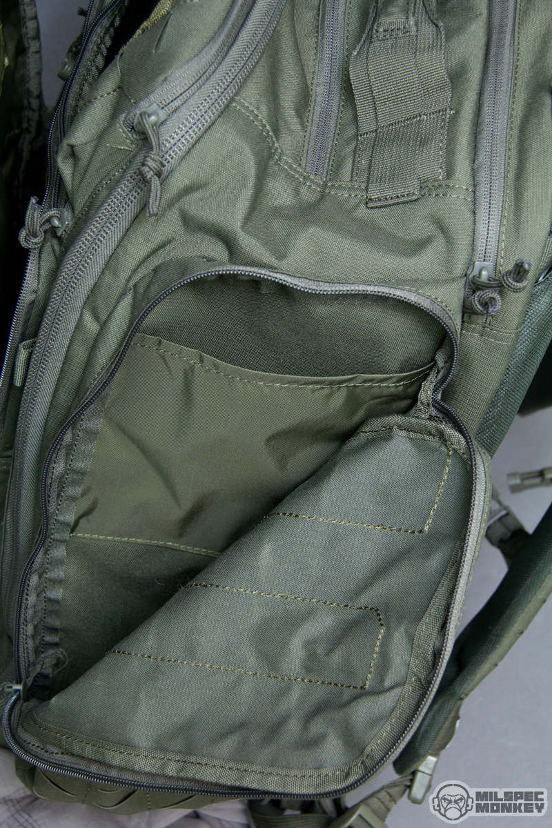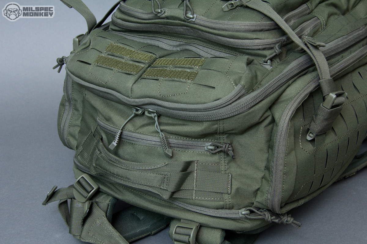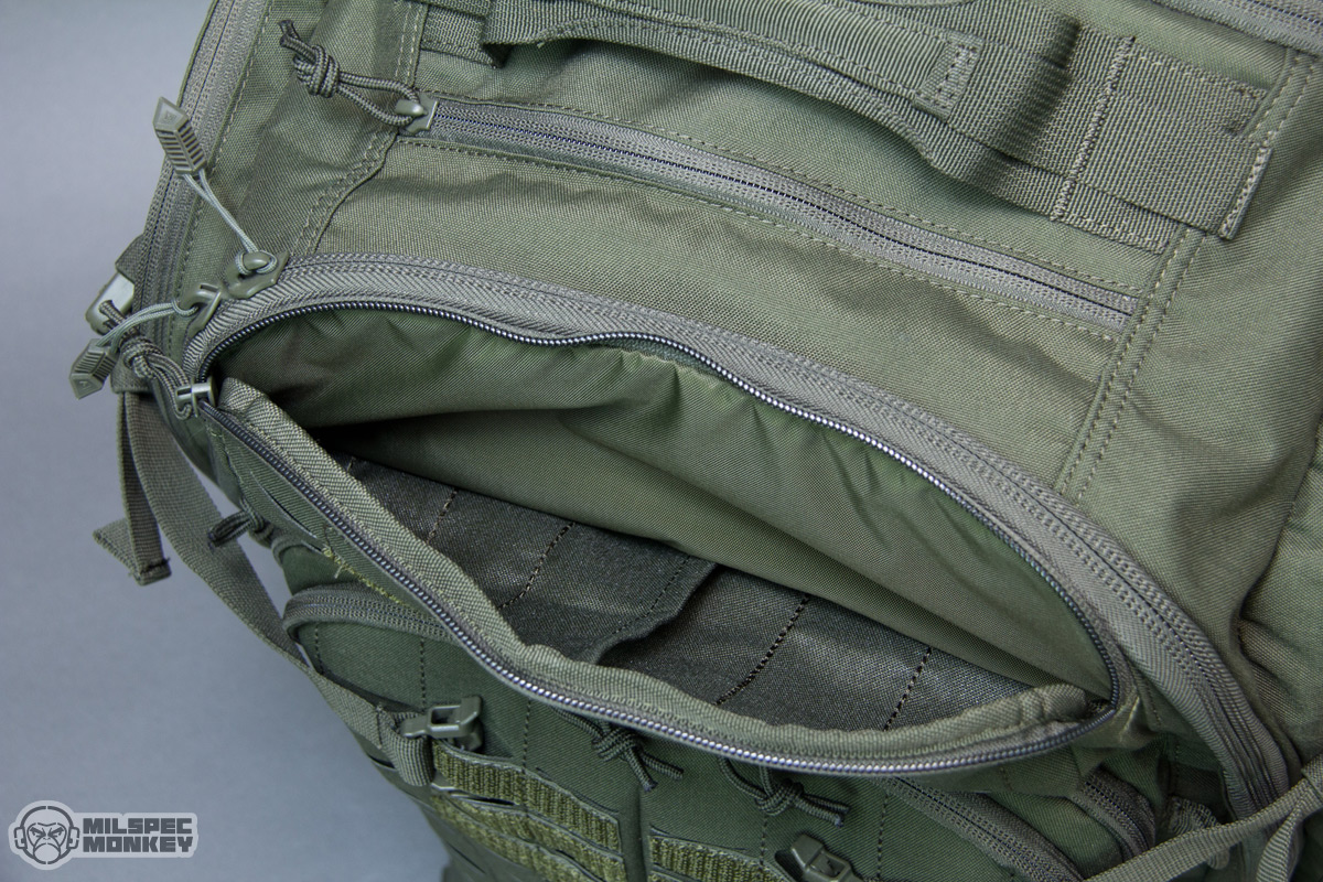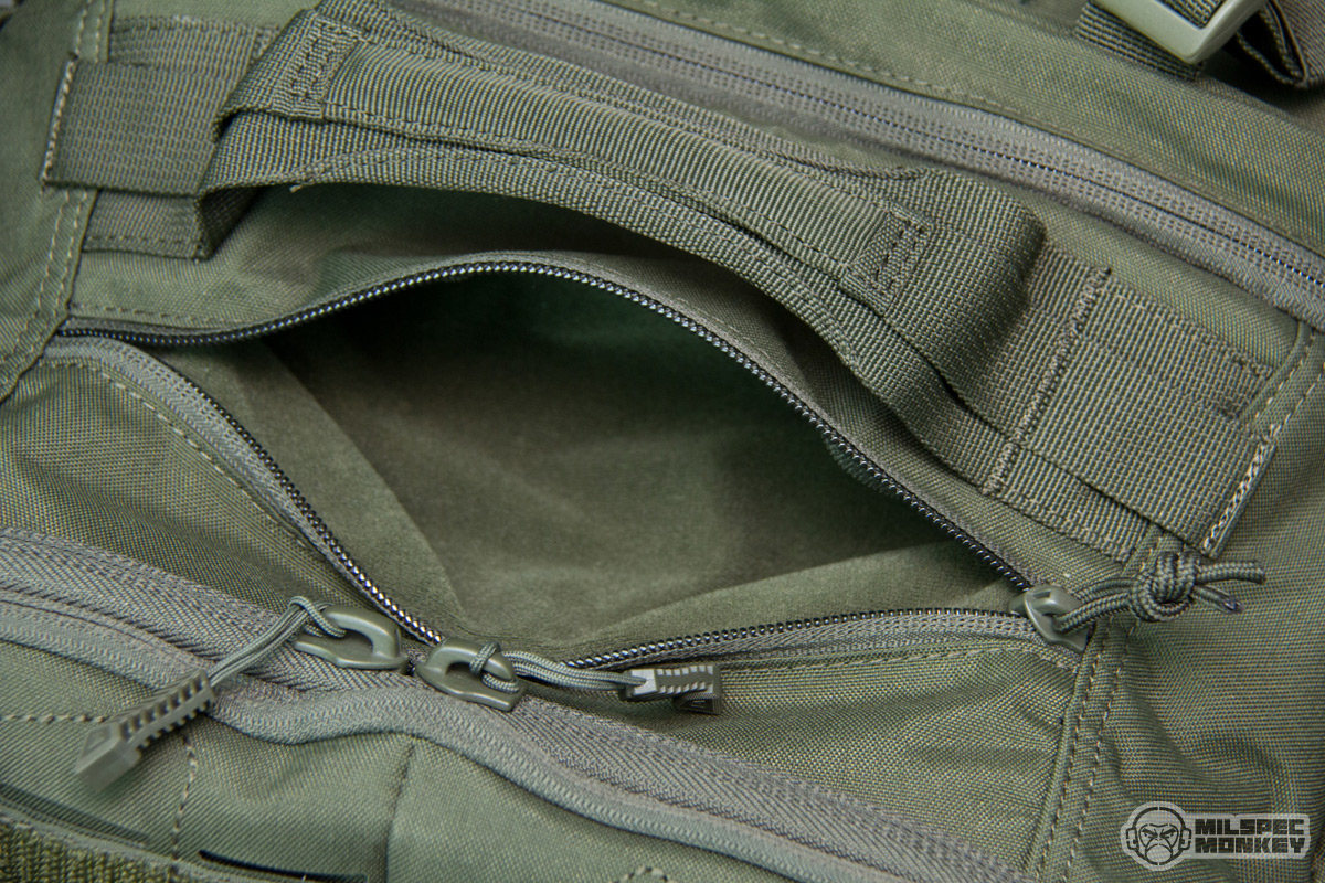Moving up is the upper frontal compartment. It uses a single zipper and the interior is no thrills, but the exterior has PALS slots and enough loop to sport a name tape or flag patches. You probably won't actually mount any pouches to this area, but the PALS slots are still useful for lashing and holding carabiner like hardware. Up to the tippy top is another single zippered pocket; this one is smaller yet lined with a soft material to make it great for holding eyewear or small electronics. As I was noting earlier the sides have new large compartments opening with single zippers. The interiors are overall simple with simple sleeve pockets on the upper interior sides. The height lets these pockets fit longer items, but the shear size can hold all kinds of gear. Just in case that wasn't enough, the side pockets have a rowdy amount of PALS slots so you can have pockets on your pockets yo.