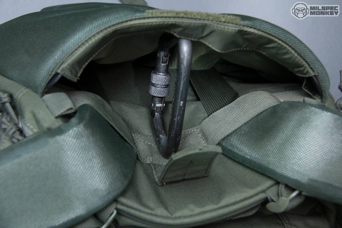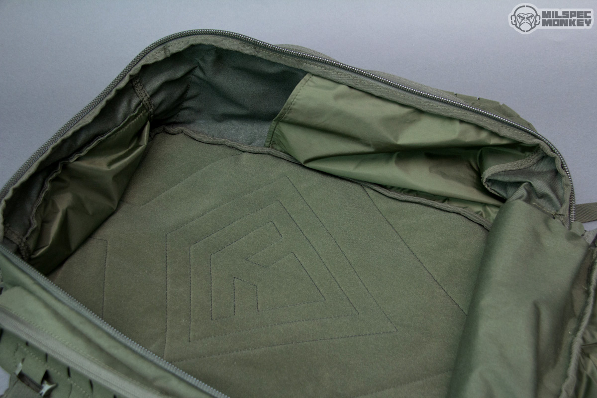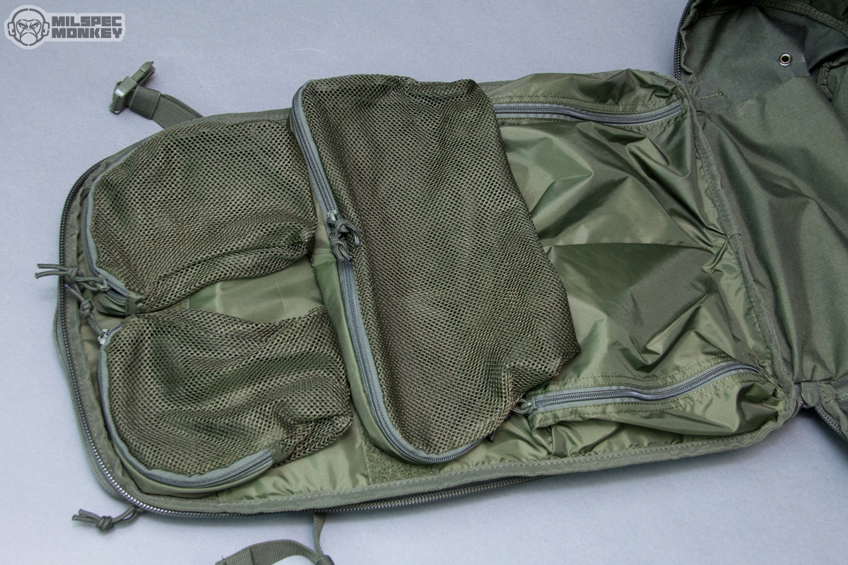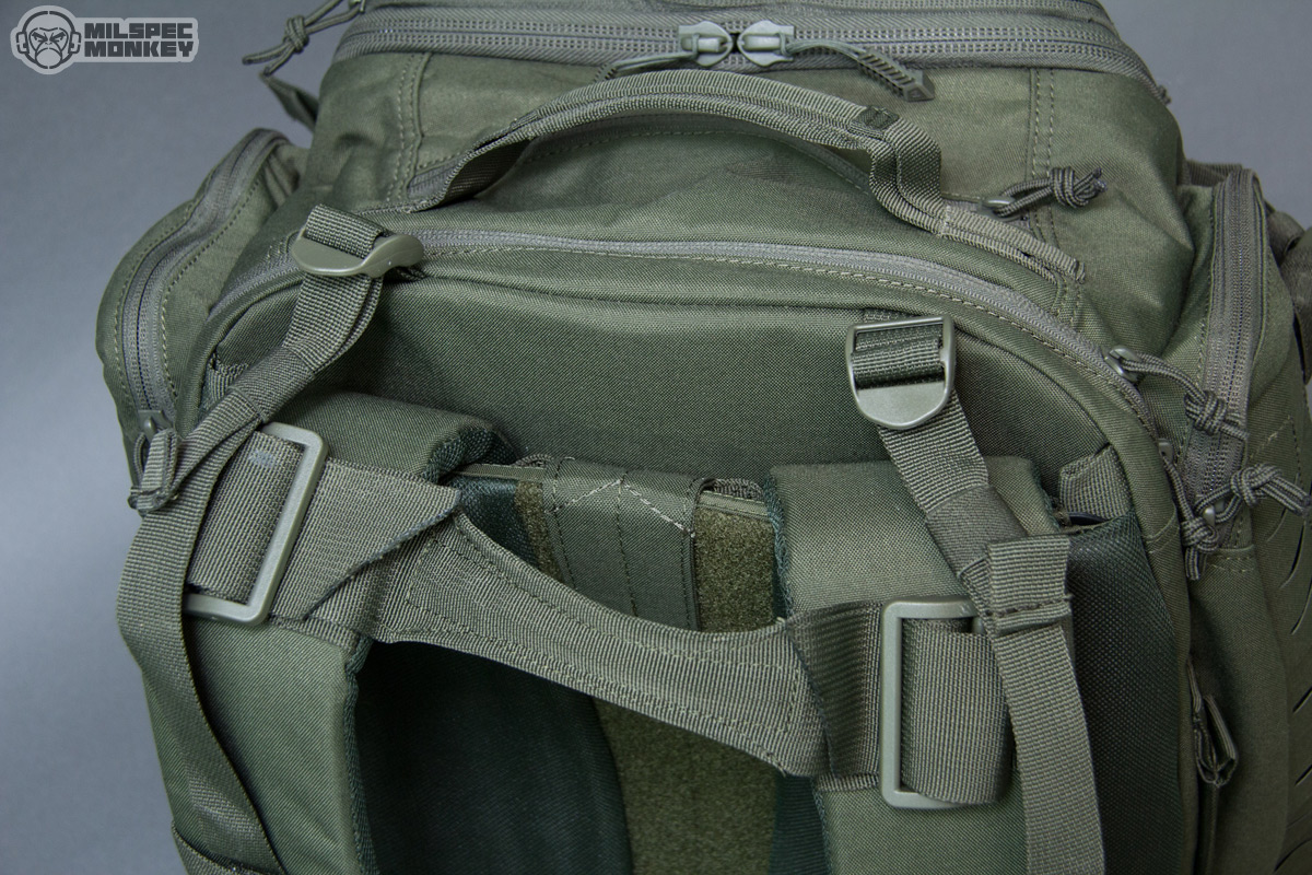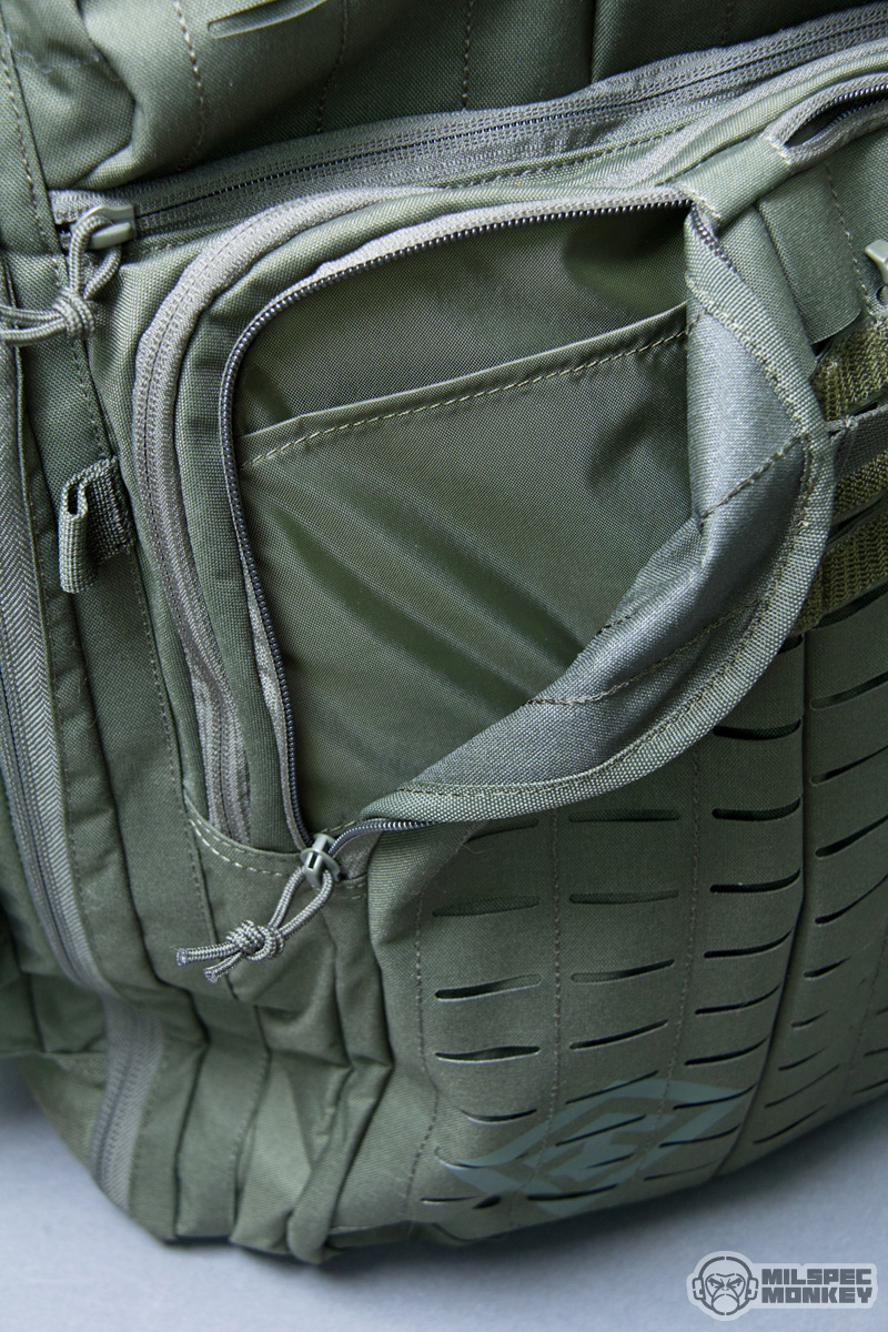 Moving up is the upper frontal compartment. It uses a single zipper and the interior is no thrills, but the exterior has PALS slots and enough loop to sport a name tape or flag patches. You probably won't actually mount any pouches to this area, but the PALS slots are still useful for lashing and holding carabiner like hardware. Up to the tippy top is another single zippered pocket; this one is smaller yet lined with a soft material to make it great for holding eyewear or small electronics. As I was noting earlier the sides have new large compartments opening with single zippers. The interiors are overall simple with simple sleeve pockets on the upper interior sides. The height lets these pockets fit longer items, but the shear size can hold all kinds of gear. Just in case that wasn't enough, the side pockets have a rowdy amount of PALS slots so you can have pockets on your pockets yo.