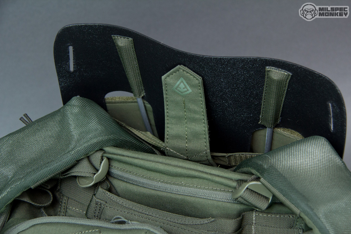 The last back compartment is actually more just access to the rigidity backboard and shoulder straps. You likely won't need to mess with this much, but pretty cool you can take out the backboard or add a some more length to the shoulder straps if desired. I didn't think about it till seeing the First Tactical video, but they also had some cool backup plans for the backboard including shovel, paddle, splint or brace. Moving forward a little is what some may call a hydration pocket, yet with the zipper access at the bottom it can be dual purposed to to work with First Tactical's Hook and Hang Thru System. This area interfaces with First Tactical's Rifle Sleeves which is a pretty cool option. This compartment has G-hook like hangers as part of the system along with some extra sleeve pocket storage inside. I ended up with a longer than planned Rifle Sleeve, but one can see on the pics it works out even at rowdy sniper rifle length. Nice touches are continued like a slot for the bottom zipper pull to be secured into. Some may wish there were specific tube ports, but the double zippers allow similar functionality.