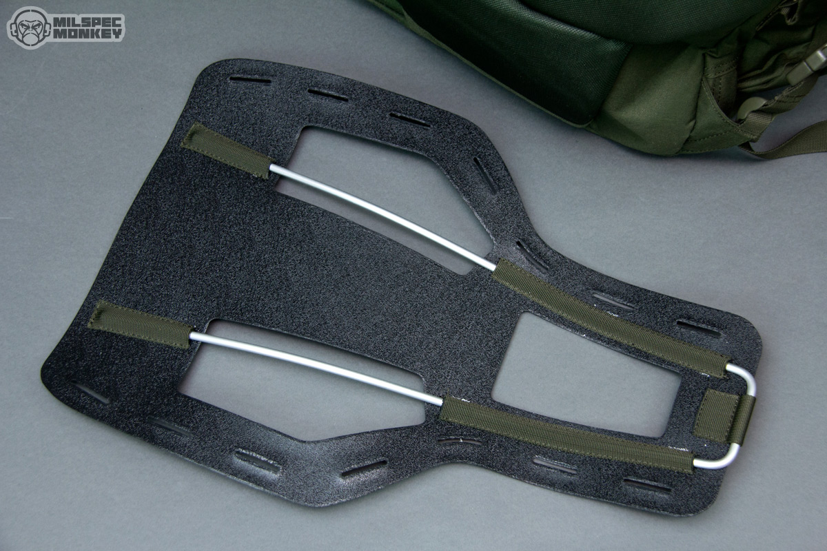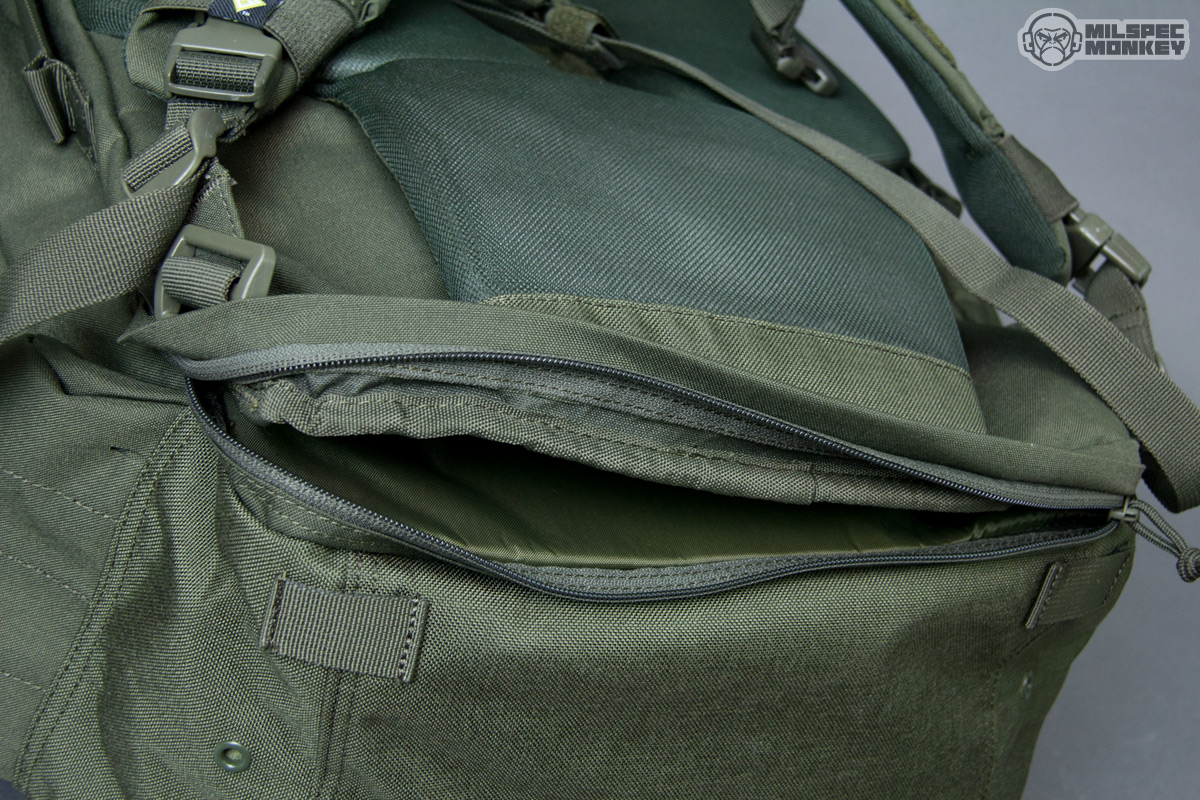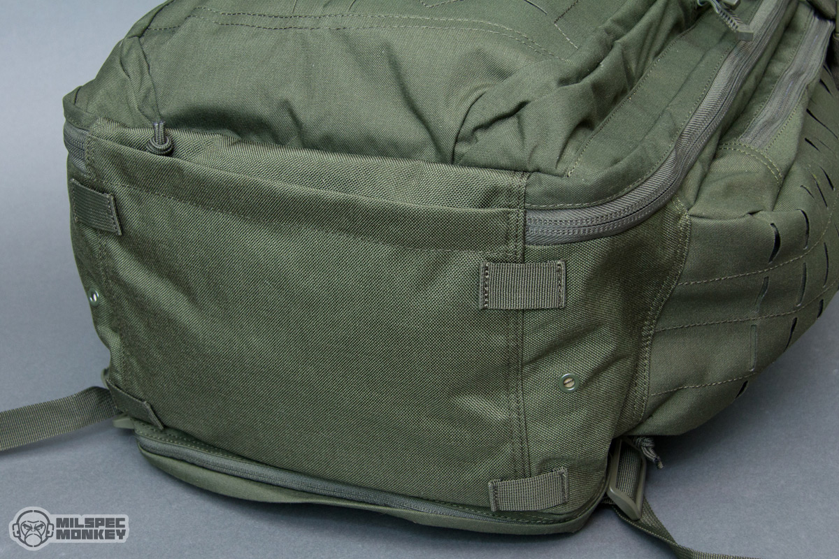 Back to the shoulder straps it is pretty cool that they have a big dose of PALS slots on the exterior and even a loop velcro zone for some cool guy patches. The sternum strap is plenty functional despite using the 3/4" webbing I'm not a super fan of and easy to adjust height placement using a slide-on-tubes setup. As a possible plus or minus depending how you look at it, the sternum strap is easy to take off by sliding up until it comes completely off. Other nice finishes are included such as elastic over the main SRBs (buckles) to prevent accidental release and hook-and-loop straps to manage webbing slack. On the bottom there isn't a whole lot of webbing, but there is enough to lash things down to like bedrolls. One may also notice the grommets are off to the bottom sides and this is because there is a sneaky small zipper pocket at the bottom.