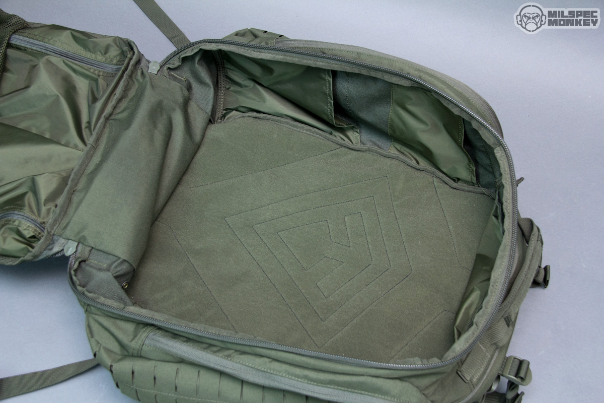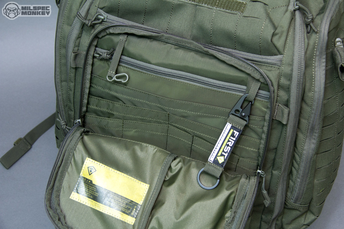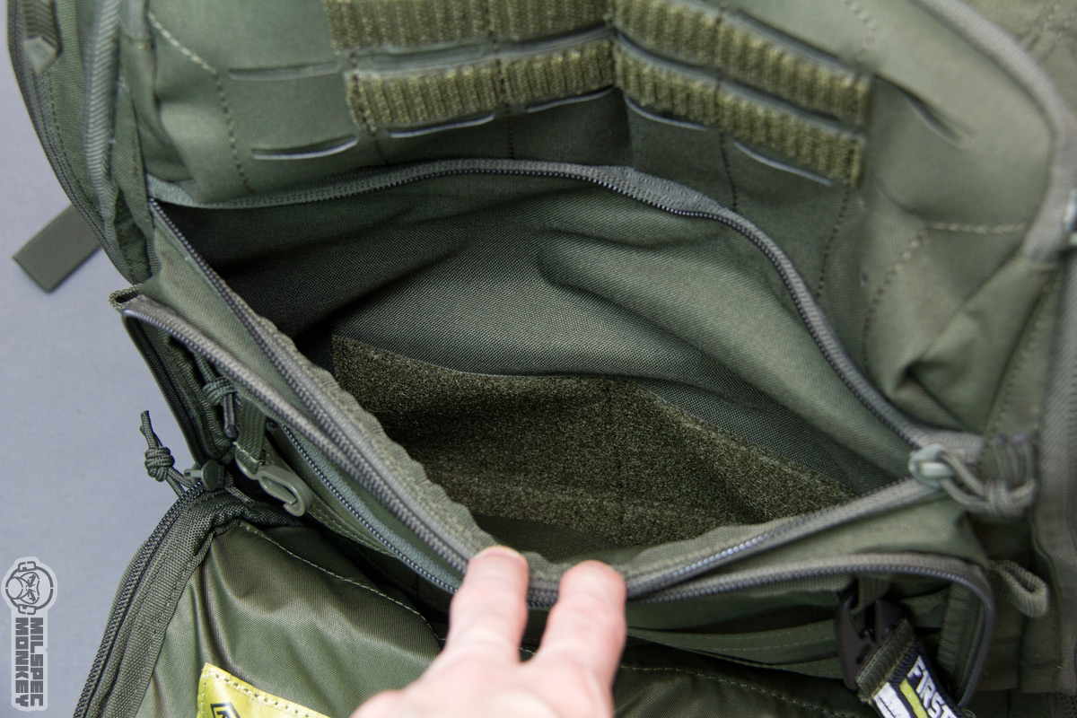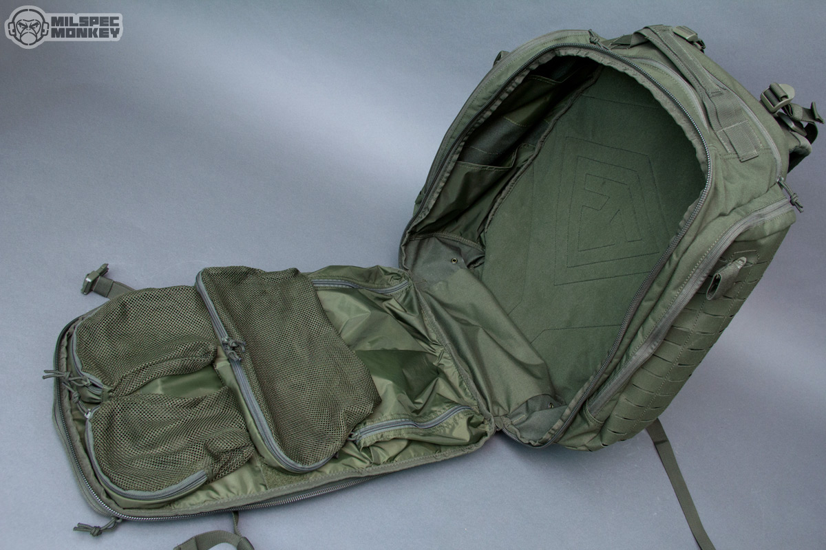 Finally on to the main compartment, the big show opens up clam shell style with double zippers. The zipper-pulls are unique and grippy, but I think the cord is a little long as it seems the other pulls work a little better or generally helps grabbing closer to the slider. These more fancy pulls are only used on the main compartment and larger frontal compartment perhaps to help ID the zones. Inside is a nice big compartment with the back being a soft yet velcro/hook compatible material. It isn't as grippy as full on loop, but you can still rock some hook backed accessories for further organization. The sides have some simple sleeve pockets, one side having a deep pocket and 2 offset pockets on the other side, good for quick stashing. The front interior has some cool mesh pouches, 2 small with single zippers and 1 long with dual zippers that attach with hook. Only a little hook is used, I believe, to allow the pouches to fill out better. Since easy to tear out they make for great medical storage, but can be useful for all kinds of things. Also not to be forgotten, since hook backed, one can attach these mesh pouches to the back of the main compartment if they like that setup better. Under the mesh pockets are some more vertical style pockets that open with single zippers. It seemed a little weird to me at first, but after inquiring with the designer they do make sense as the intended option of ambidextrous stash pockets that can be accessed with the pack front mounted. Even if not used for that, the pocket shape will give some options not seen in many other packs. Worth noting, First Tactical is starting to offer more hook backed pouches to work with these type interiors along with other cool purpose built organizers.