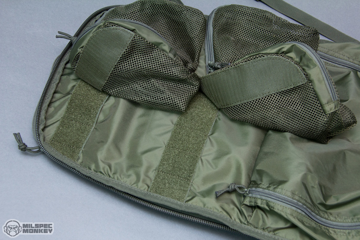 Jumping around to the front, the mid front zone has single zipper compartments on each side for ambidextrous accommodation. The inside of each has a few simple sleeve pockets height tiered for good stash zones and organization. Worth noting is the exterior has a solid amount of loop coming in around 6"x3" to offer a lot of patch mounting options. Behind this zone is a dual zippered compartment that is quite the organization party. The sleeve pocket sizes are greatly varied to help with holding options and even a single zippered pocket in the back for additional security options. One of those dumb plastic keypers is on the upper left, but they make up for it by having a hanging loop and full on sweet keychain rig on the upper right. Easy to overlook, just a little ways above is a single zipper CCW compartment. The area has a good overall size and a loop zone to interface with hook backed accessories like holsters. It is a little sad to have a single zipper here to mess with the ambi capabilities, but I understand the compromise as dual zippers would make the opening smaller and thus harder to whip out a pistol quickly.