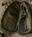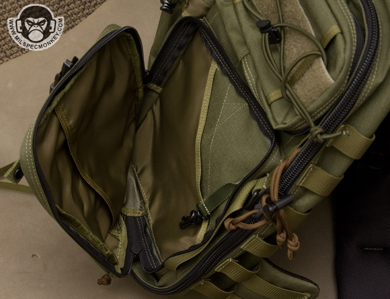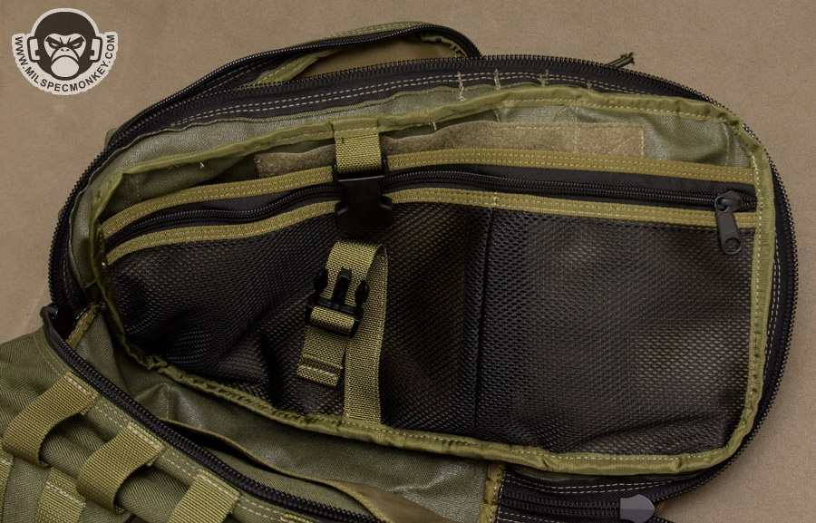 Keeping with the chest access theme, the zipper placement to the main interior is done appropriately. It isn't quite clamshell as that would be floppy, but still a good sized opening. The interior back has simple sleeve pockets divided into one fairly large and one small pocket. The tension of the fabric here makes the pocket useful for both slim and medium thickness items. On the other side, the interior front, a lot is going on starting with a zippered mesh sleeve pocket. It is divided similar to the other side creating large and small pocket areas. Behind this is a large sleeve pocket with a good sized loop velcro panel. This has good potential for CCW or other velcro add-ons. An SRB strap is incorporated to assist in compressing the whole interior front if desired.
