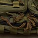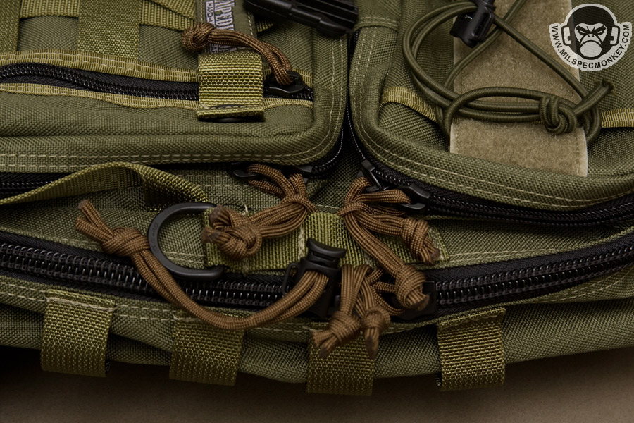 Maxpedition uses their standard Y-strap for compression, since not a large pack I'm glad to see there are no extra side compression straps. Personally I'll take the Y-strap off, but I can still see many others will find it useful. The upper front pocket needs a name as it is used on many designs these days. I'll wing it and call it the Sandwich pouch due to the many layers, and I bet that shit can hold a sandwich too! So anyway, just in case you are confused, the Sandwich pocket has a loop velcro sleeve and a shock cord rig on the outside. The idea appears to be able to lash on items externally or hold longer items like beat sticks. The zipper opening has been adjusted to be optimized for usage while the Sitka is chest mounted. Inside is the usual sleeve pocket with elastic webbing. The height is a little stubby, but the overall size of the interior of the sandwich pocket is pretty good. Moving down the exterior is a rectangle pocket. A slim zippered pocket gives quick access and has a security snap. The snap piece can be additionally used as a quick lash point. Although offset for the zipper, PALS is on the exterior for mounting options. Mounted to the exterior side is a handle which assists in both this pocket and whole pack manipulation. The double zippers to inside this pocket are also placed with chest mounted access in mind. Inside, sleeve pocket design keeps up with this concept and a key lanyard is included. For a new idea Maxpedition added a webbing and cordlock system as an anti-theft deterrent. It won't save your backpack from being stolen or anything, but it is used to lock down all of the cord pulls so gremlins will have a much harder time trying to get into any pockets. This would apply to a pick-pocket situation were the pack is still worn by the user. Back to the exterior, the left side has a generous sized water bottle pocket with cord-lock closure. The right side is more minimal with PALS to allow customization with additional pouches. Since not quite 3" wide, the PALS channels are longer than usual to allow fudging of pouches that may need 1 or 2 channels. Up top is a pretty serious pull handle making grab and go easier. The main shoulder strap is well padded like the whole back of the pack. They are pretty off-spec, but a variety of PALS-like webbing is on the shoulder strap exterior to all general mounting. A HK hook is mounted as an attachment bonus. If one needs to get into heavier movement, a cross strap is available and I like how a tuck-hole was integrated into the bottom back for storage when not in use. Incorporated into the back is a large pocket good for holding hydration bladders or concealed weapons thanks to the loop velcro panel inside. Older pack designs required one to take off their pack to access this pocket, but when chest mounted, opening the zipper is not bad at all on the Sitka.