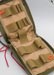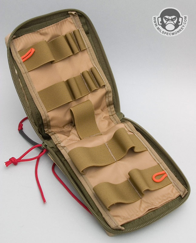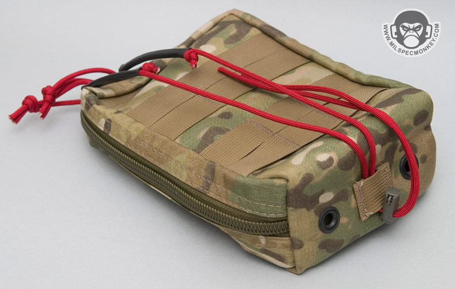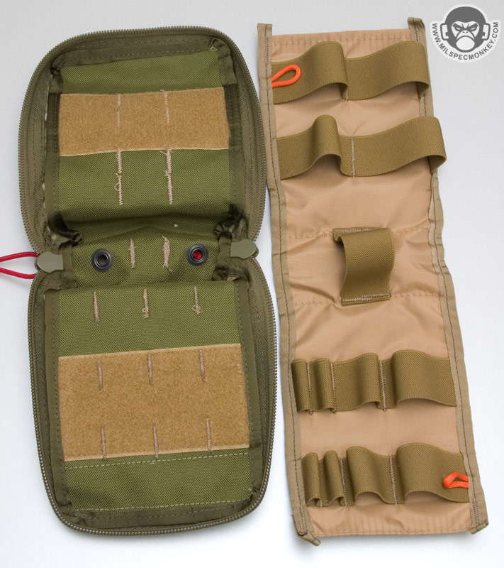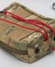 This pouch is the result of Esstac's take on a breakout med pouch. Based on a GP shape, the pouch unzips clamshell style. The front has PALS, loop velcro for pouches, and a shockcord rig for extra tie down options. The red cord is a part of the cool quick deploy system in which one just pulls down on the cord at the bottom of the pouch which causes the zippers to unzip the pouch. Generally this works pretty well, but one does need to make sure the red cords are lined up on the sides of the pouch along the zipper. On the inside is a nice pannel full of various elastic loops to suit many needs. At the ends are extra loops using the binding tape to allow additional cord pulls if desired. The whole pannel rips out using velcro and is a good balance of usage so that it is stable, but not too difficult to rip out and get down to business.