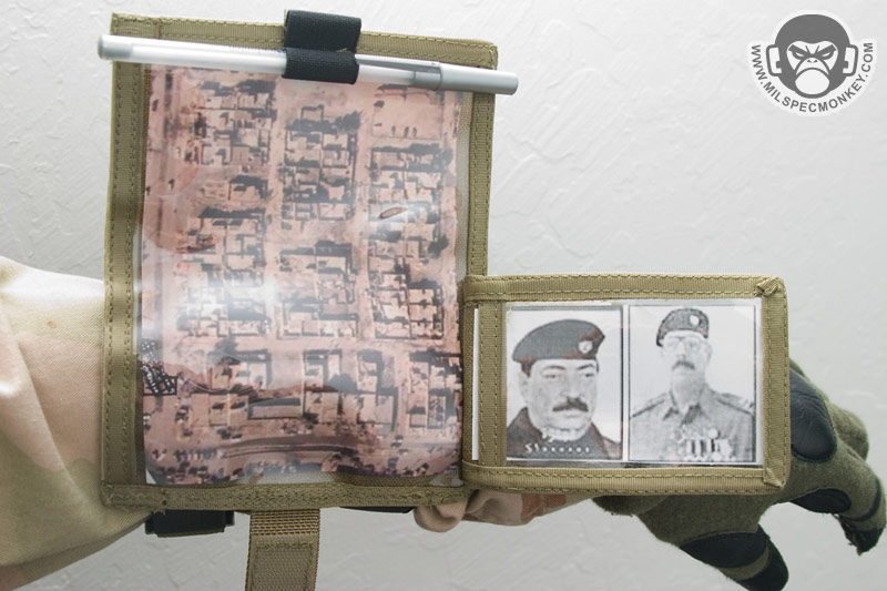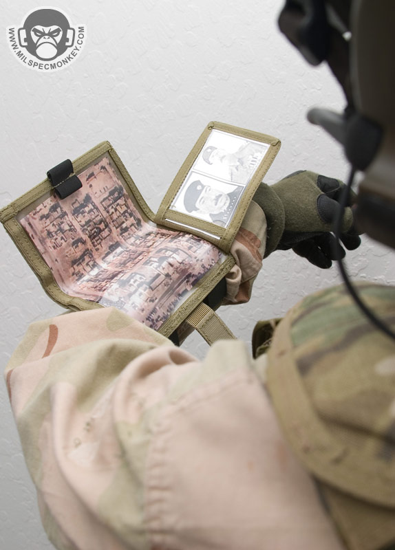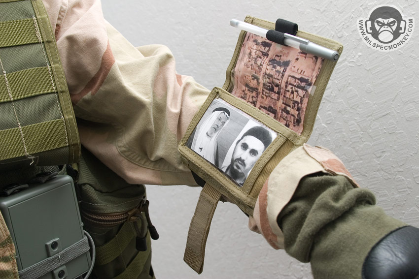 For those who could use a quick no hands-mission cheat sheet, you might want to look into this lil guy. The strap sizing and orientation is made for the left arm, but one can wear it on their right arm with the flap opening towards the body rather than away. All connections and seals are done with velcro which includes the straps and the main clear vinyl opening. Although the space isn't vast, the main pocket works well for holding a small map. Elastic is sewn onto the edge of the flap pannel to allow a place to put 2 pens or pencils. An extra smaller swing-away clear vinyl pocket is attached which can be good for quick notes or HVT pictures. Since the pannel wraps around your wrist, the map doesn't lay flat, but this didn't seem to be too big of an issue for usage.