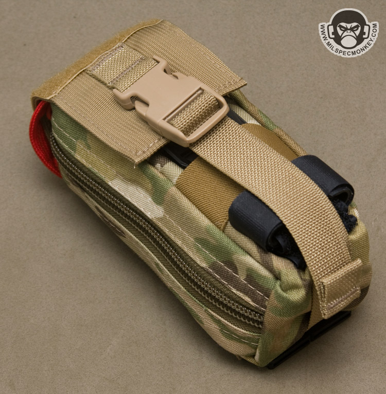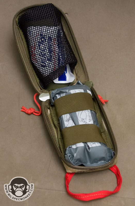 There is still room to pack in more goodies. As for how the pouch functions, it is a tear away design so great for getting it off one's body. Just release the main SRB and manually tear it off the panel or use the incorporated pull handle. The tourniquet is easily accessible one the SRB is released. Double zippers are used for the main compartment in a clamshell opening configuration for full access. Inside, one side has simple elastic webbing and the other has nylon mesh to give solid holding options. For bonuses there is loop velcro on the platform lid for medical or blood ID and a full set of PALS webbing on the back; Long MALICE clips included. For tight teams with assigned medics, this pouch may be a good option for most of the other team members to hold the essentials while not taking up too much space.