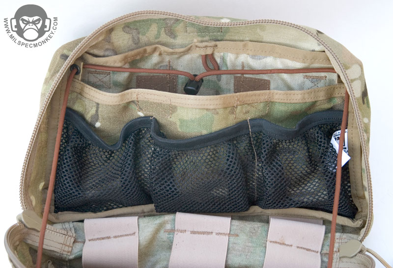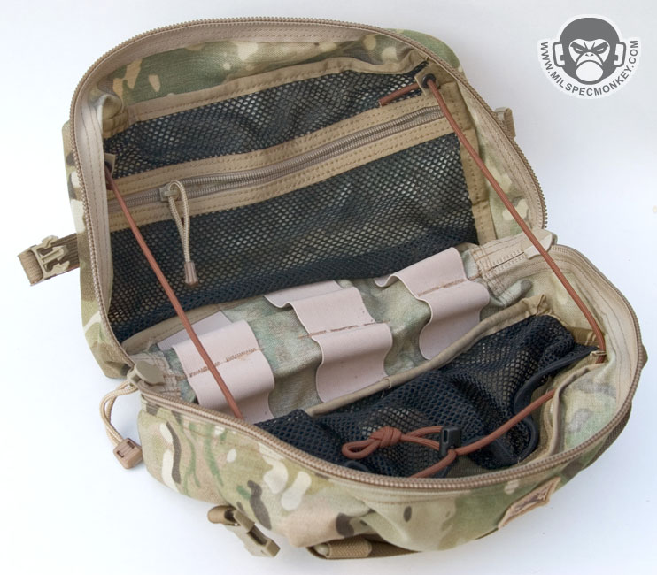 The inside is full featured with zippered mesh pocket, mesh dividers, and additional loose velcro pocket with elastic loops on the bottom. To top it off there is a 550 cord and cordlock setup to adjust the opening angle since the zippers go all the way to allow for 180 degree opening. They are hidden in the pics, but there are also D-rings on the back for further attaching options. Comes with 4 long Malice Clips.