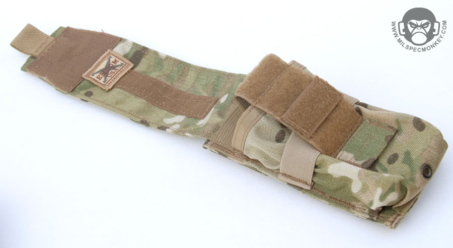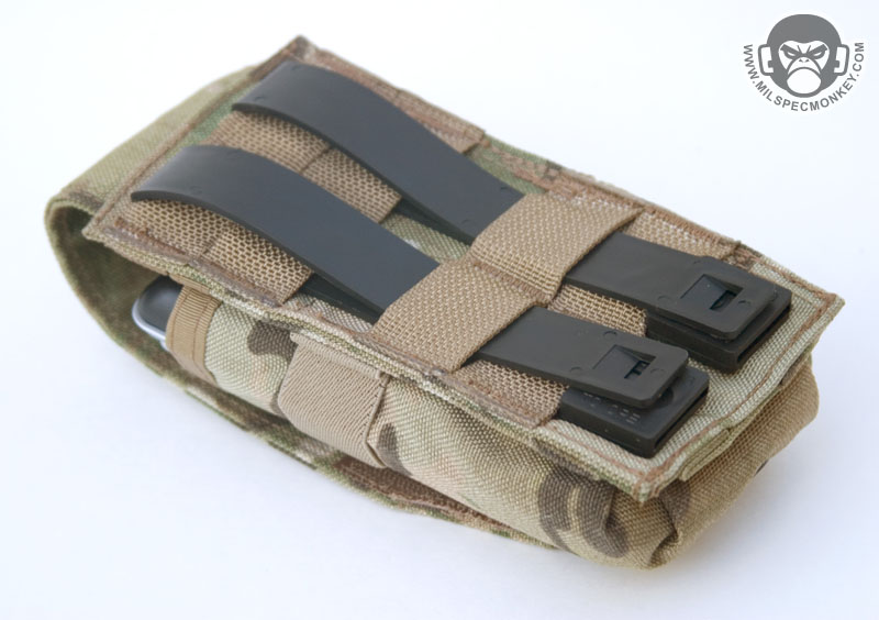 There are a lot of double mag pouches out there, but this one has some solid bonus features. For starters there are PALS loops on the front so one can mount pistol mag pouches, but these loops also assist in setting up a shock cord mag holding system. The main flap can be totally removed or have its placement adjusted to hold pretty much every kind of mag out there no matter what added accessory. Interior elastic allows one to fold the flap for a secure open pouch setup. I've embarrassingly shown it here holding a Nintendo-DS, but check out Emdom or Military Moron's site for many great bullet tote'n pics. Comes with long Malice Clips.