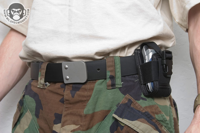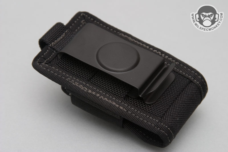 The inside is lined with soft goodness to play nice with your phone and won't scratch it up. The elastic sides work well for adjustability and hold, but also don't smash in buttons on the sides of most phones. The female part of the SRB is mounted directly on the holster so you only have to worry about the male strap when connecting and releasing. I wish there was a clever way to get the holder strap out of the way when releasing one's phone, but I find knocking it away to the side is not too bad. The holster comes with a beefy heavy duty spring steel clip that has a jet black power coat and can accommodate up to 2.25" belt loop. This clip has a great grip, but if you would like different mounting options, you can easily take it off and use the PALS webbing. A short Malice clip (sold separately) fits in there nicely or if you want to get a little wacky, one could thread a thin belt through there for a horizontal holster mount. Currently only available in Black and pictures show a Sony Z525a phone as a demo piece.