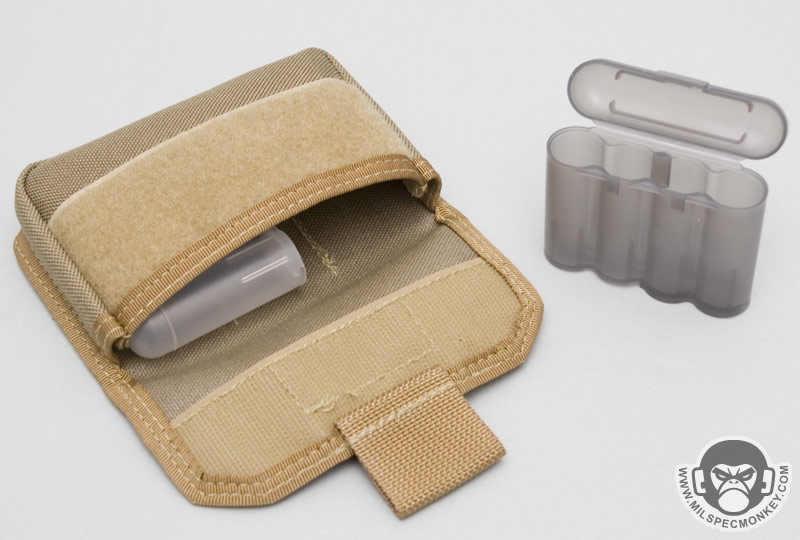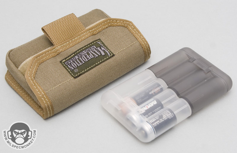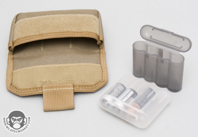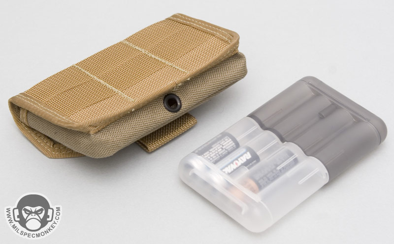The Volta is a simple, but useful little pouch where the main idea is to hold the specialized plastic battery holders. You get one clear and one smoke BATUCA battery holders that can hold 4 CR123, AA, or AAA batteries in each holder for a total of 8. The color difference allows one to separate used and fresh batteries.