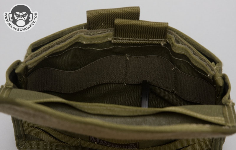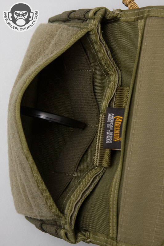 With a generous amount of loop velcro on the front, this allows large patch placement such as designs Law Enforcement use. The main compartment has a sleeve pocket on the interior back and the elastic on both sides now has a larger division for more holding options. The middle pocket is the high security pocket fully sealed with velcro closure. Staggered pull tabs assist in opening this area. Most items will be plenty secure anywhere in the pouch, but this pocket allow smaller items to be contained with confidence. Moving forward is the frontal pocket which has elastic on the back side divided 4 times fairly evenly spaced. The back has larger than spec PALS channels to allow mounting fudging using 2 long Malice clips. If desired, more clips can be used to give a tighter mount.