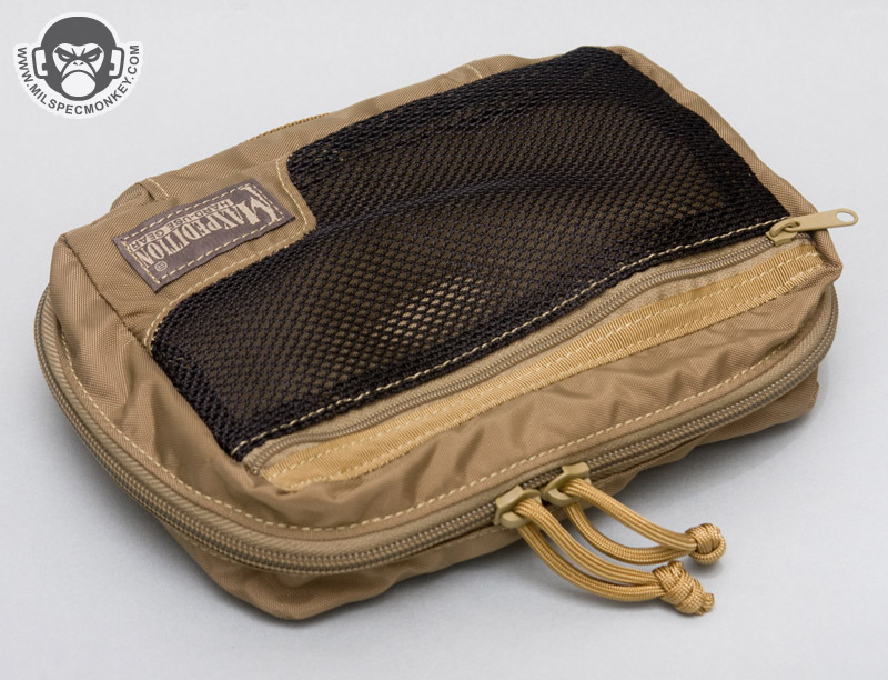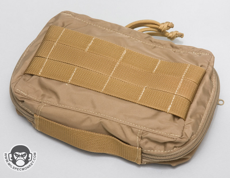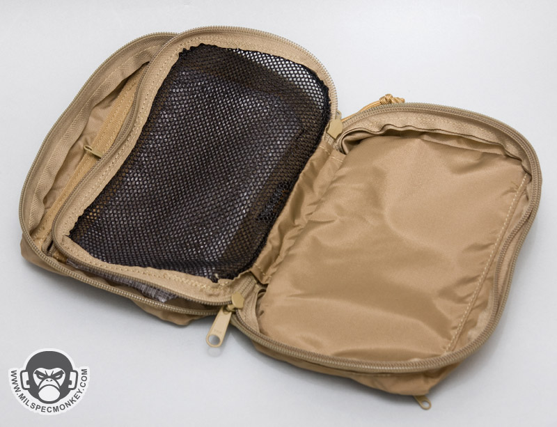 In the front is a mesh zippered pocket allowing ease of visibility and accessibility. The back has a good strip of PALS ready to take 3" TacTies or short Malice Clips. One can get away with 2, or go up to 4 for a more firm attachment. The main opening is a double zipper clamshell design to allow full access to the interior. One side has a partial see-through single zippered pocket while the other side has another clamshell double zipper opening mesh pocket. This allows some options for items depending on if they need to be air'd out or more protected. Although not a big med pouch it is large enough to hold medical basics such as shears or a full size tourniquet. Since not a tear away design I see it as more of a boo-boo pouch when mounted onto gear or placed inside larger packs. A bonus webbing handle is on the bottom for such usage. During less tactical moments it works great as a travel pouch with toiletries inside. As a small suggestion, would have been nice to see some elastic webbing in the interior. When zipping up the main compartment, sometimes the interior mesh pocket zippers stick out, luckily this is not a huge stoppage issue. For those who don't need something all high speed, this is a great lightweight pouch that can be well stuffed full of goodies.