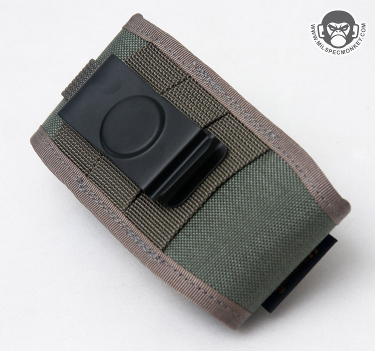 A beefy heavy duty spring steel clip is included that has a jet black power coat and can accommodate up to 2.25" belt loop. This clip has a great grip, but if you would like different mounting options, you can easily take it off and use the PALS webbing. A 3" Tac Tie (sold separately) fits in there nicely or if you want to get a little wacky, one could thread a thin belt through there for a horizontal holster mount.