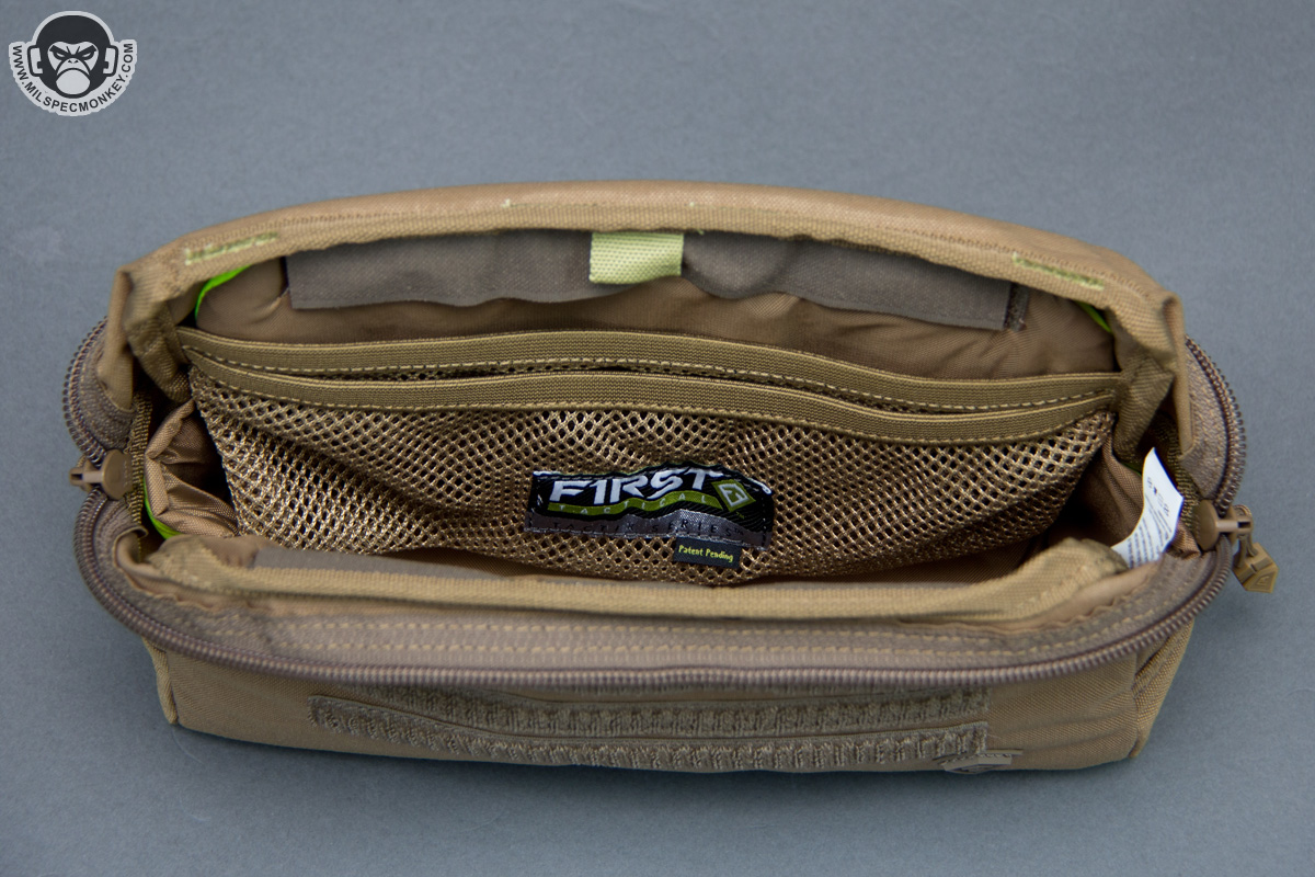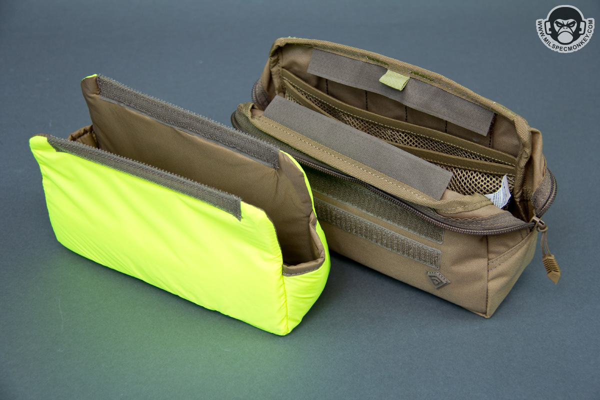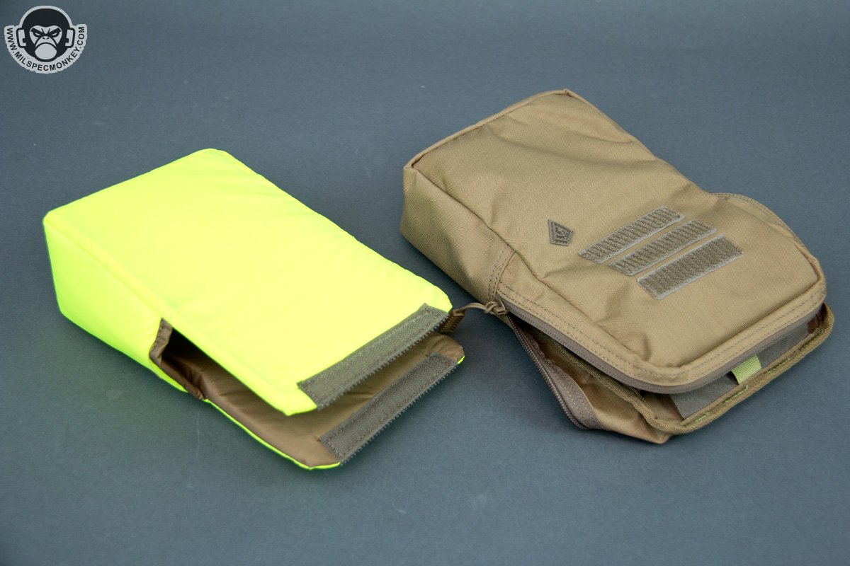 Where appropriate most of the pouches have reversible HD foam sleeves included by default which lets one have padding if desired, or can easily take the foam sleeve out (attached with simple hook and loop) to give back a little more holding capacity. The reversible factor is a nice touch as well letting the user pick if they want a more contrasting interior or just an exterior matching color. Like on their bags, First Tactical has their own textured zipper pulls and use 1" loop strips to give patch mounting capability. On these pouches I wish they just used wider loop instead of 1" strips. The 1" makes sense on the packs since they need to leave room for the attachment slots, however this does not apply to the pouches. Perhaps they just got a good bulk price on the 1" and not a deal breaker issue either way.