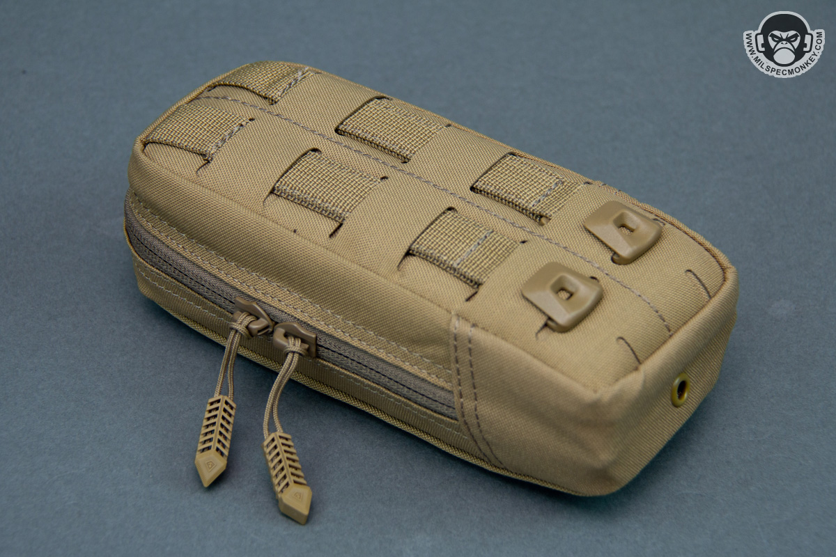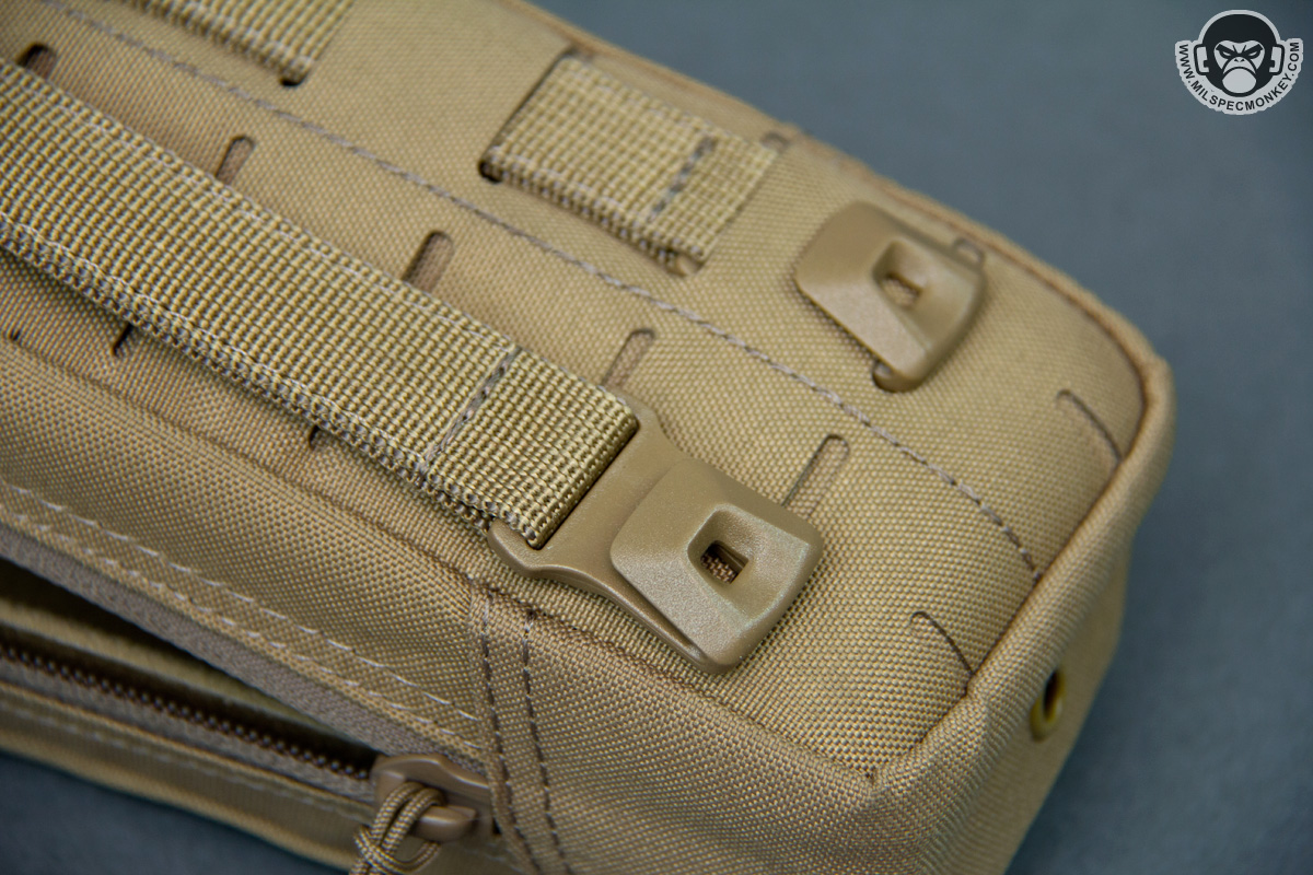 For common features the main construction material is a 500D nylon, although not Cordura specifically it acts comparable and does not come off feeling cheap. First Tactical has also come up with their own PALS/MOLLE attachment system which can be pretty hard to make a new one these days. Using webbing and custom plastic hook ends they work pretty good giving a positive snag point at all times by design. With the hardware being overall low profile they are generally easy to weave through webbing / slots, however doing the final connection hook at the end can take a bit more effort. Since the hooks don't protrude out from the bottom connection they stay out of the way, but then there isn't much to grab onto while doing the last weave. Fortunately if this is a super con for anyone, adding slim pull-cords to the holes in the hooks would be an quick way to make mounting First Tactical pouches easier.