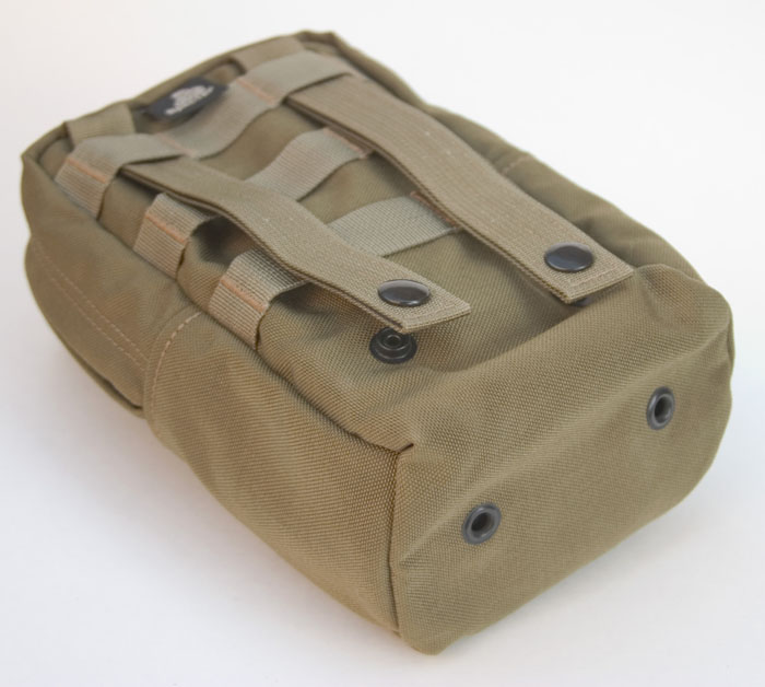 Notes: Solid no-nonsense pouch. For a side torso pouch the pullstrings are a little too loose causing the pull force to wrap around. Basic MOLLE snaps for PALS connection.