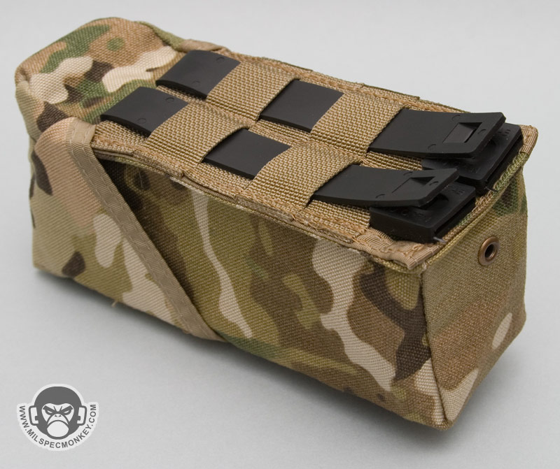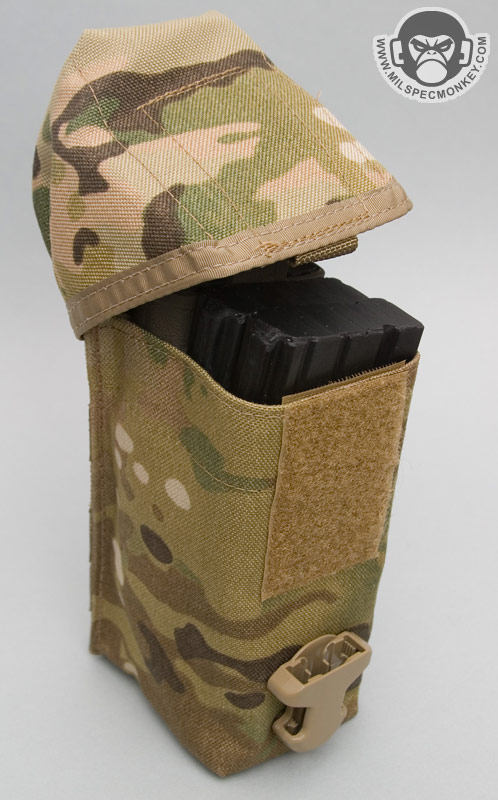 This pouch is simple but is effective at fulfilling a dual role. Originally made to fit 2 AK magazines, users also found that it was good fit for 3, 30 round NATO magazines. The flap fully covers the opening to keep out dust and stay secure. 2 flap securing options are available to allow the user to use both the fastex buckle and velcro, or just one. A hook velcro sheet is connected to the main body loop velcro area so one can easily fold it over to nullify the velcro seal on the flap. When the connection is desired, the hook sheet just hangs out flat inside the pouch. The fastex buckle female part is lower front mounted so you can count on its placement while the male part is traditionally sewn on for adjustability. The interior has a strip of black ballistic material to improve durability and water resistance with a grommet at the bottom for drainage. When using the pouch in 3 mag NATO mode, it can easily accommodate fullsize magpulls. I asked TT why there was no elastic or shock-cord setup and they said it was a design decision to keep user costs down and that retention methods hindered flap usage. Rattling due to heavy movement won't be too bad unless specifically 2 NATO magazines are in the pouch. The back uses 2 long Malice Clips to attach to any PALS compatible gear. If I were to add anything, perhaps an elastic band on the front or top flap to hold the male SRB piece when not in use. Currently available in: OD, Black, Tan, Multicam, ACU and Ranger Green.